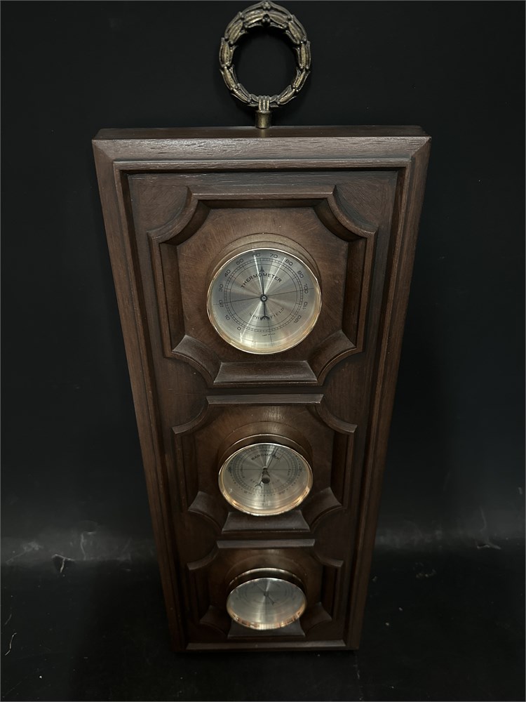 A vintage Springfield wall-mount weather station. Produced by Springfield Instruments, likely in the 1970s, it features a faux wood-grain plastic frame and was made in the USA. The unit contains three separate analog gauges. Measures temperature, atmospheric pressure to help forecast weather changes, and the moisture level in the air. 19" L x 7.5" W Good condition.