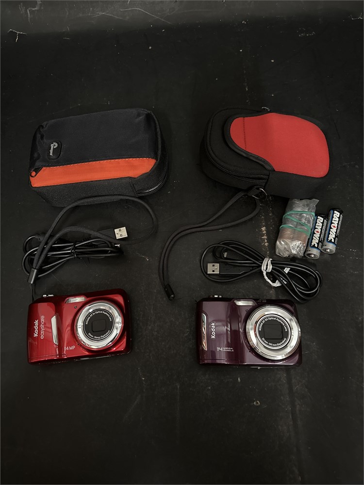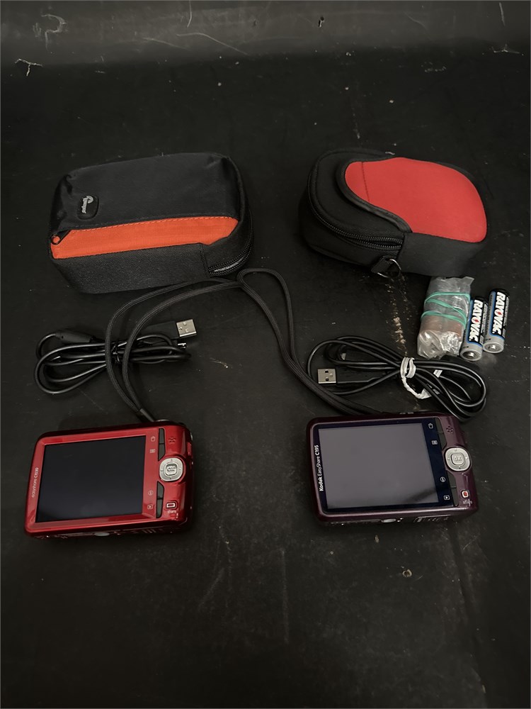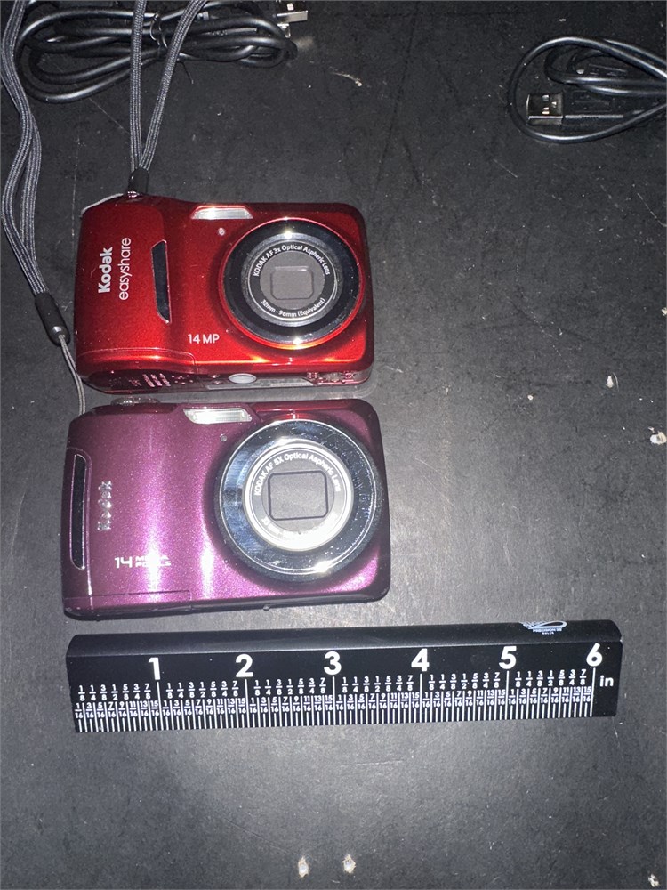 Two Canon PowerShot SX150 IS 14.1 MP digital cameras in red and brown. They feature 12x wide-angle optical image stabilized zoom. The cameras have a 3.0-inch LCD display. With connection cables and battery charger. 3.5" Good condition.