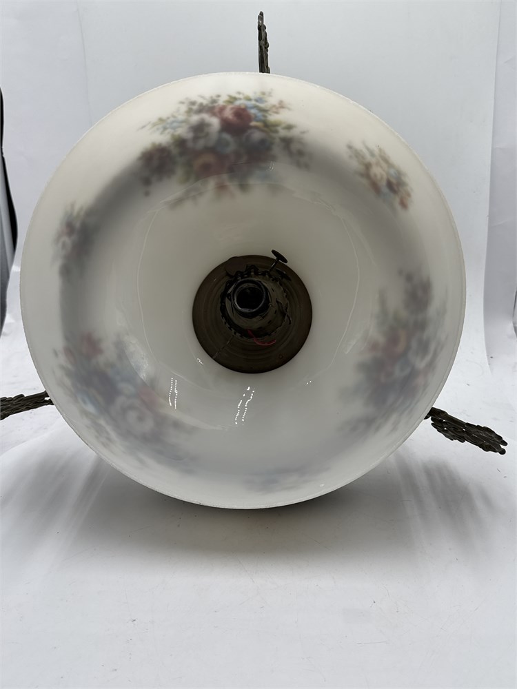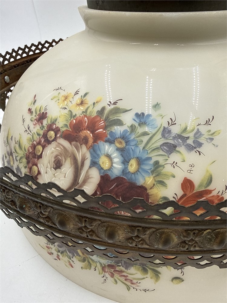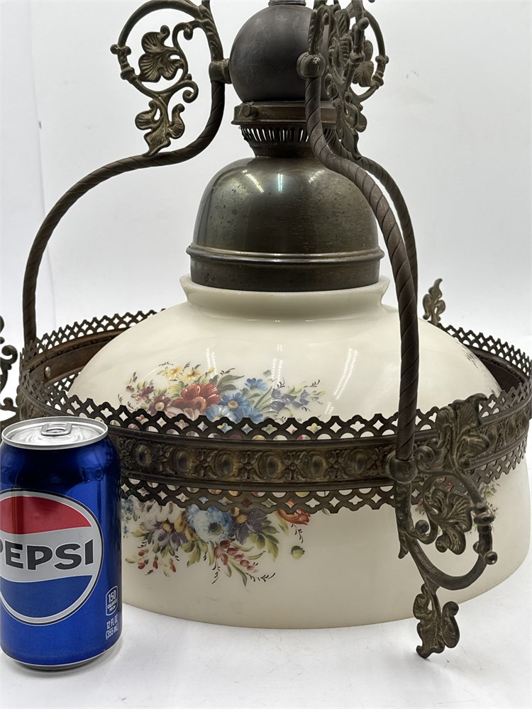 An antique Victorian-style hanging parlor lamp, originally designed as a kerosene or oil lamp and converted for electrical use. Victorian, featuring ornate brass or bronze metalwork with decorative brackets. Made of milk glass, hand-painted with floral designs. 17" H x 14" W Please note: rewiring needed for functionality.