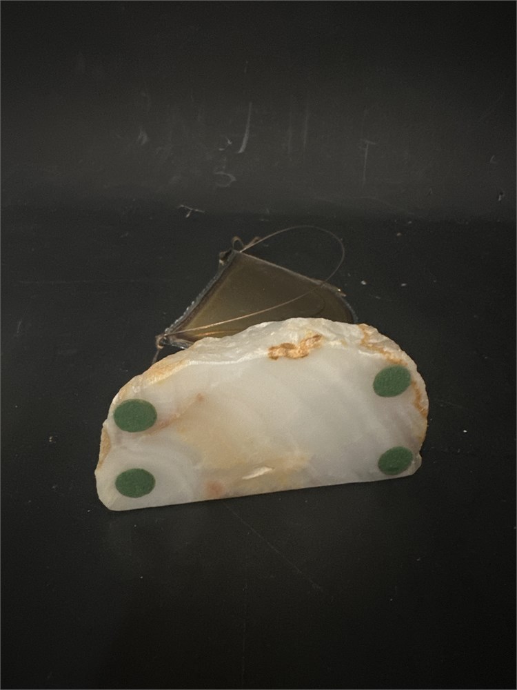 A mid-century modern John DeMott brass and copper sailboat sculpture on an onyx or quartz base. The signature is visible on the base of the sculpture. The pieces were handmade and are considered art. 10" H Good condition.
