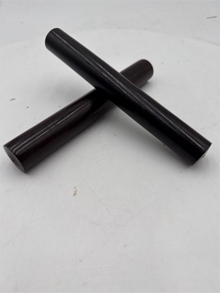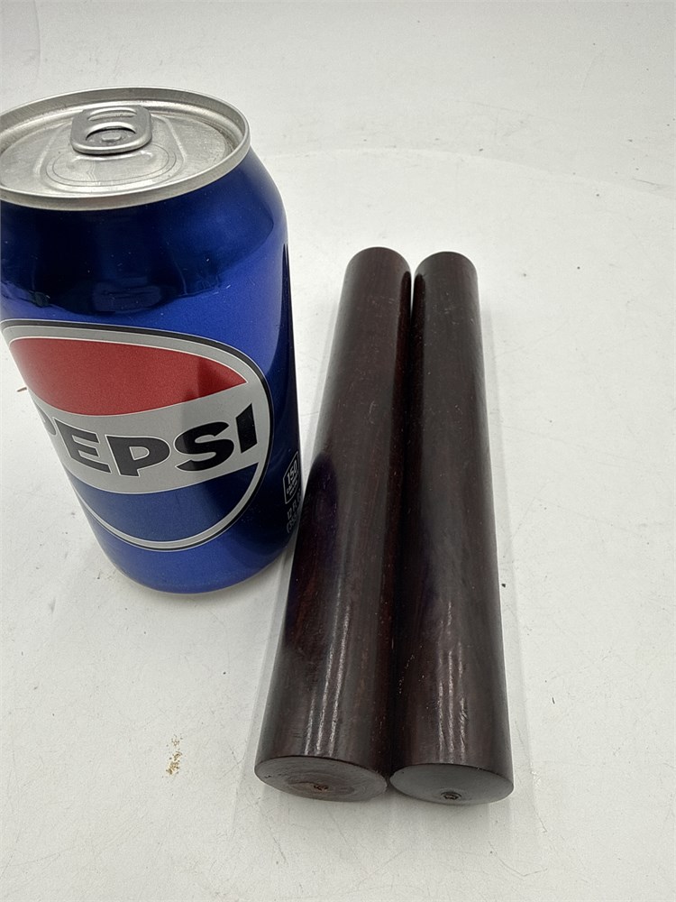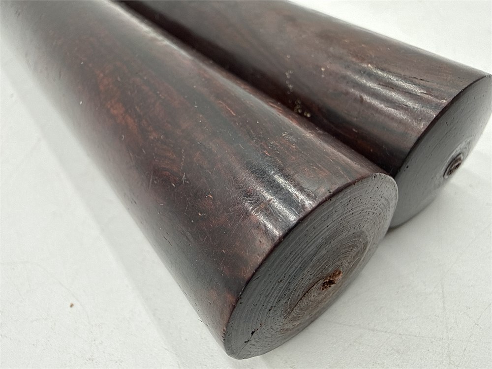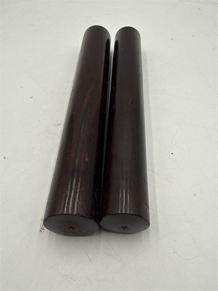 A pair of claves, which are a fundamental percussion instrument in Latin American music. They consist of two short, solid wooden sticks or dowels that are struck together to produce a sharp, resonant sound. Claves serve as the rhythmic backbone or "key" (the word clave means key or code) in various musical styles, including salsa, rumba, and son. They are made from dense hardwoods like grenadilla or rosewood for a rich, dark tone. 8" L Good condition.