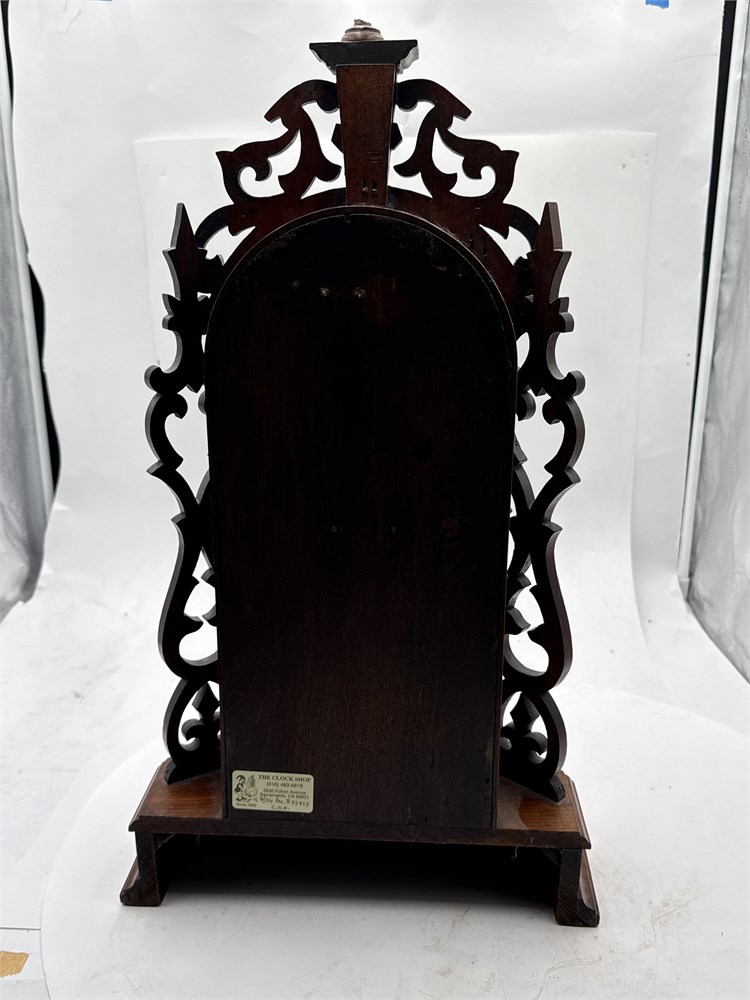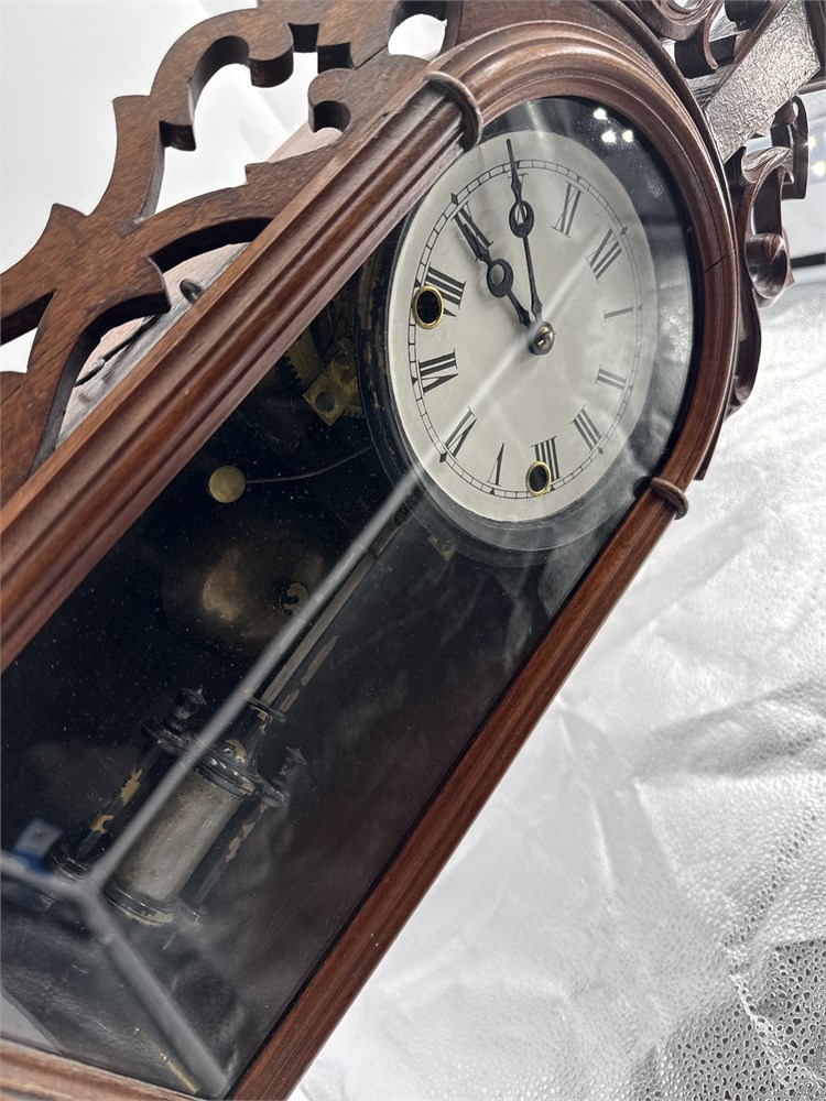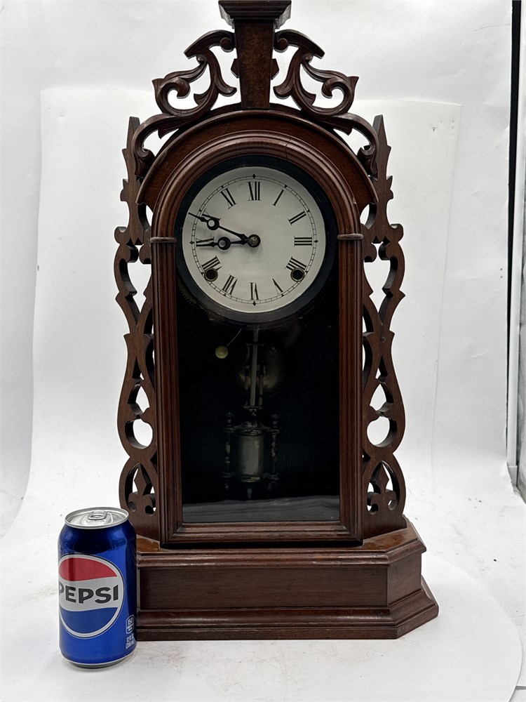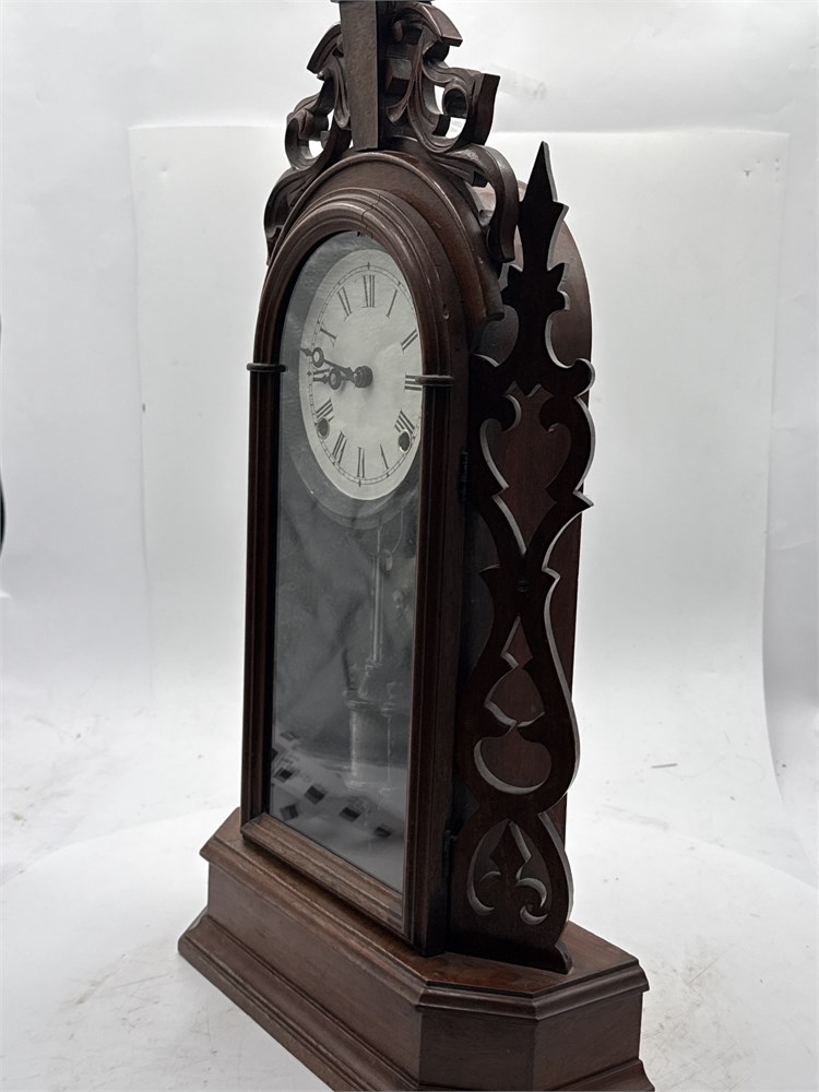 An antique American mantel clock, specifically a style often referred to as a "gingerbread" or shelf clock from the late 19th century. Carved walnut, with an original finish and aged patina. An 8-day, spring-driven time and strike movement. Comes with winding key. 22" H Good condition.
