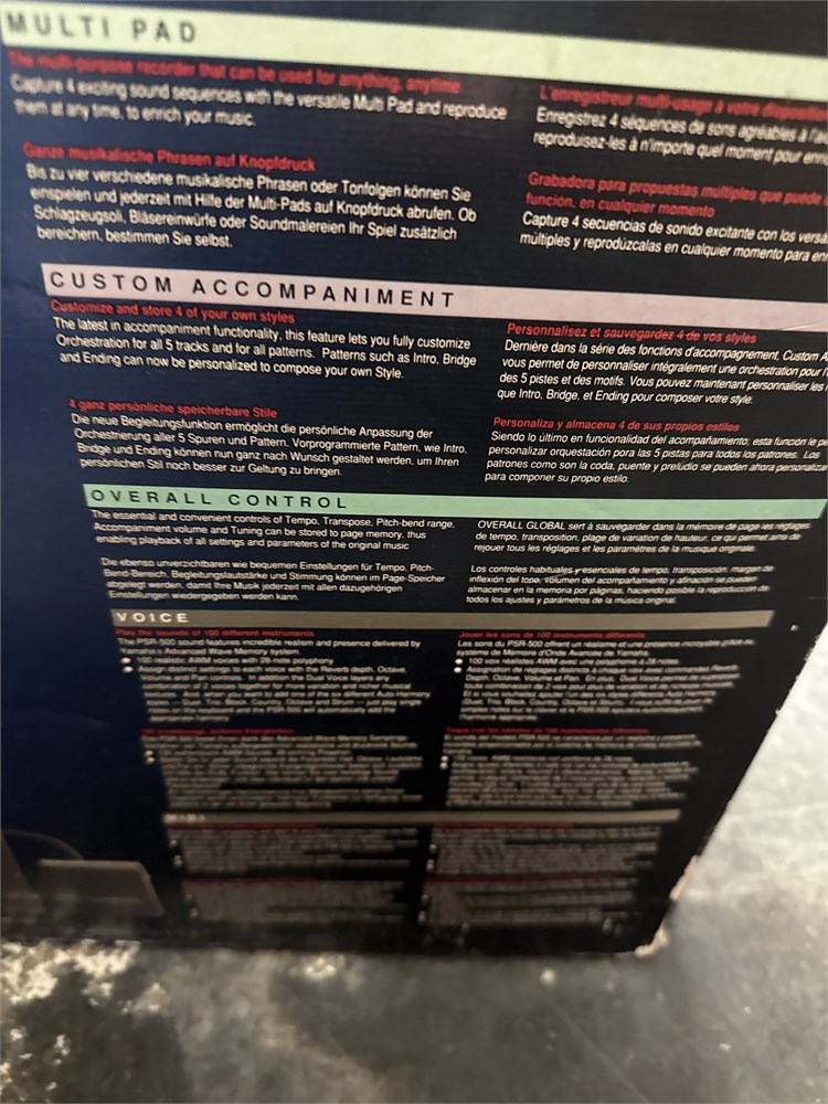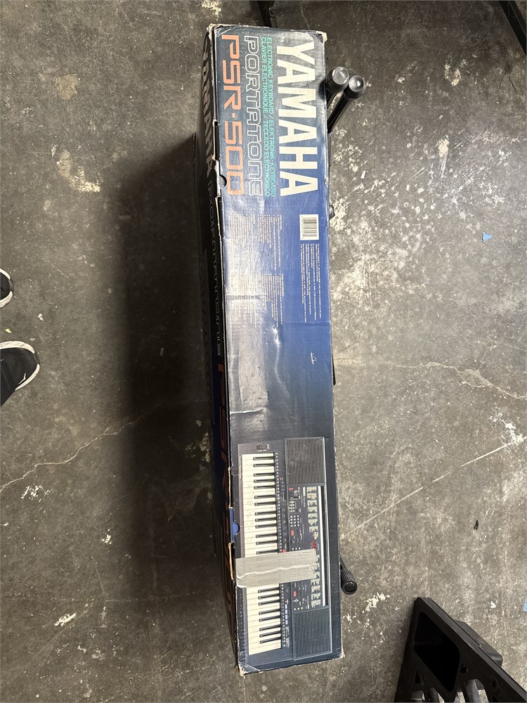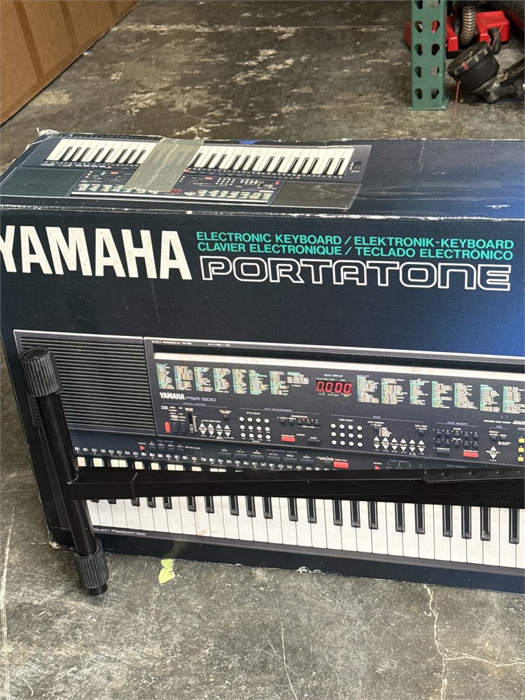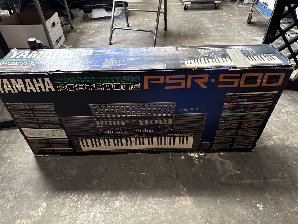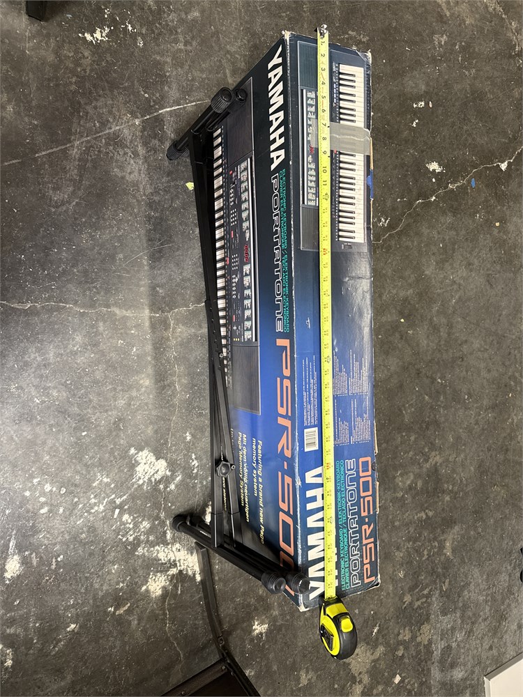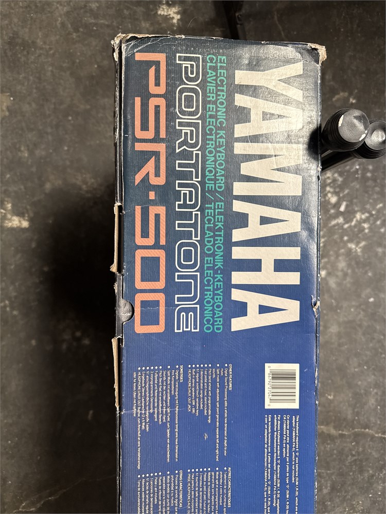 A Yamaha PSR-500 Portatone electronic keyboard. It has 61 regular sized touch-sensitive keys, built-in stereo speakers (6W+6W), digital Sound Processing (DSP) for added depth, split mode with adjustable split point, and pitch bend wheel with programmable range. In original box. 43" L Good condition.
