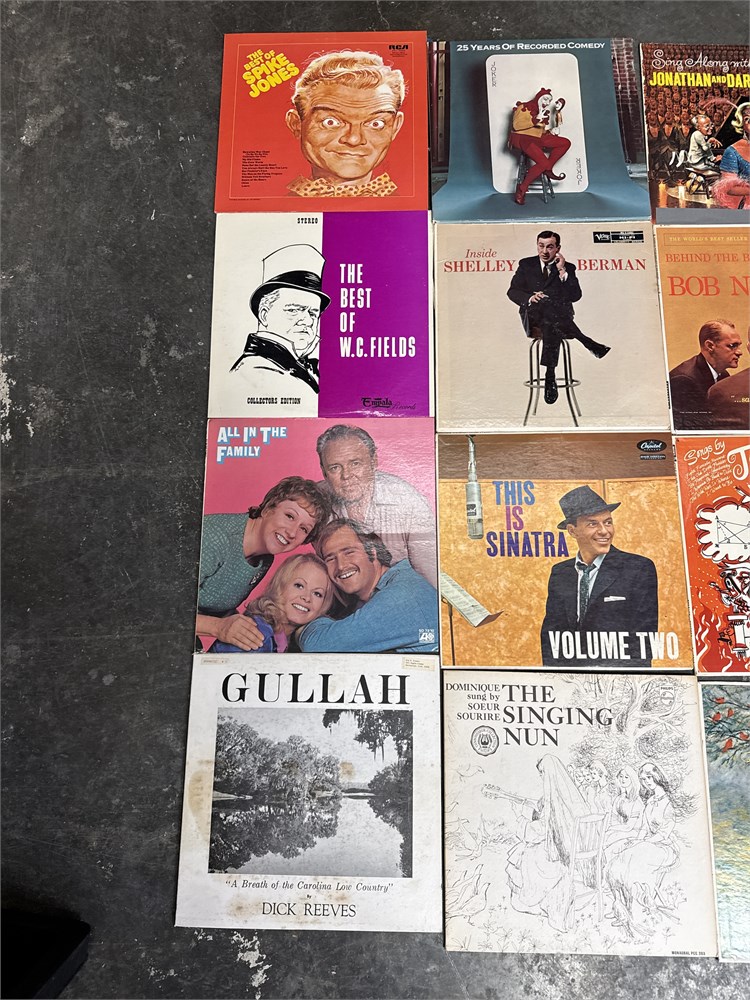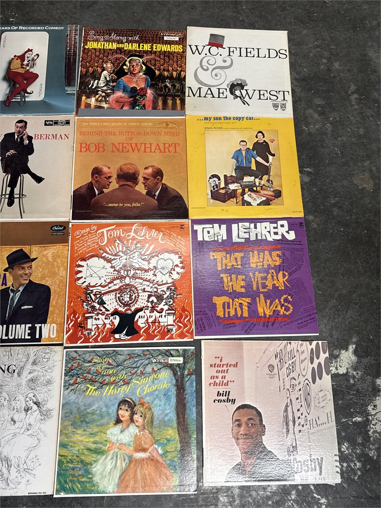 A collection of sixteen comedy and music vinyl record albums. The collection features records from notable entertainers such as W.C. Fields, Mae West, Frank Sinatra, and Bill Cosby. Specific albums include W.C. Fields/Mae West, This is Sinatra Volume Two, and Gullah. 12" H x 12" W Good condition.