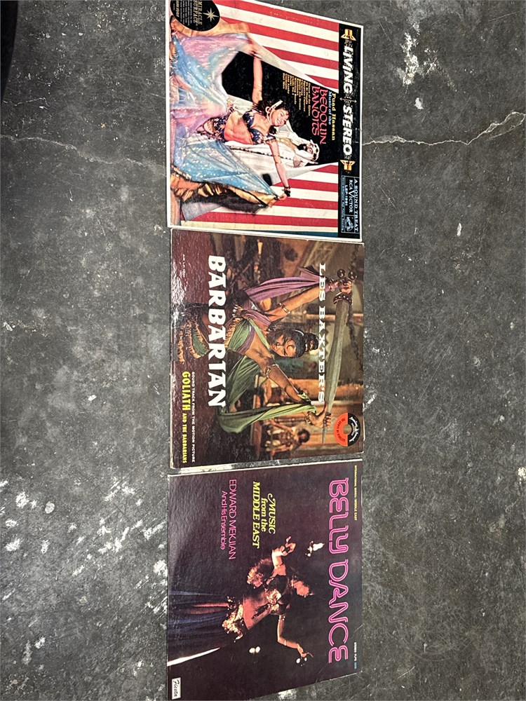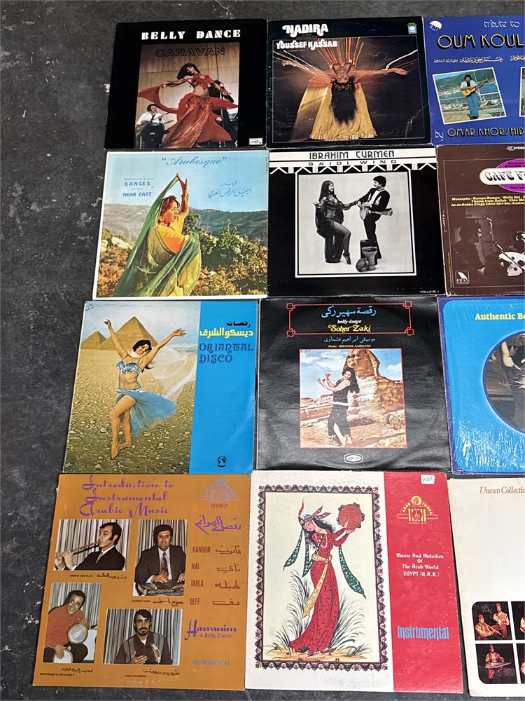 A collection of sixteen vintage vinyl records primarily featuring Middle Eastern and Arabic music and belly dance compilations. The collection includes music by prominent artists like Umm Kulthum, a legendary Egyptian singer often referred to as "The Voice of Egypt". Other featured musicians include Omar Khorshid, Youssef Kassar, and Ibrahim Curmen. Genres and themes span traditional Arabic instrumental music, Armenian songs and dances, and belly dance music. 12" H x 12" W Good condition.