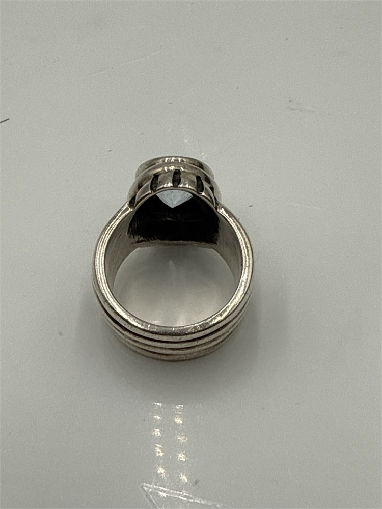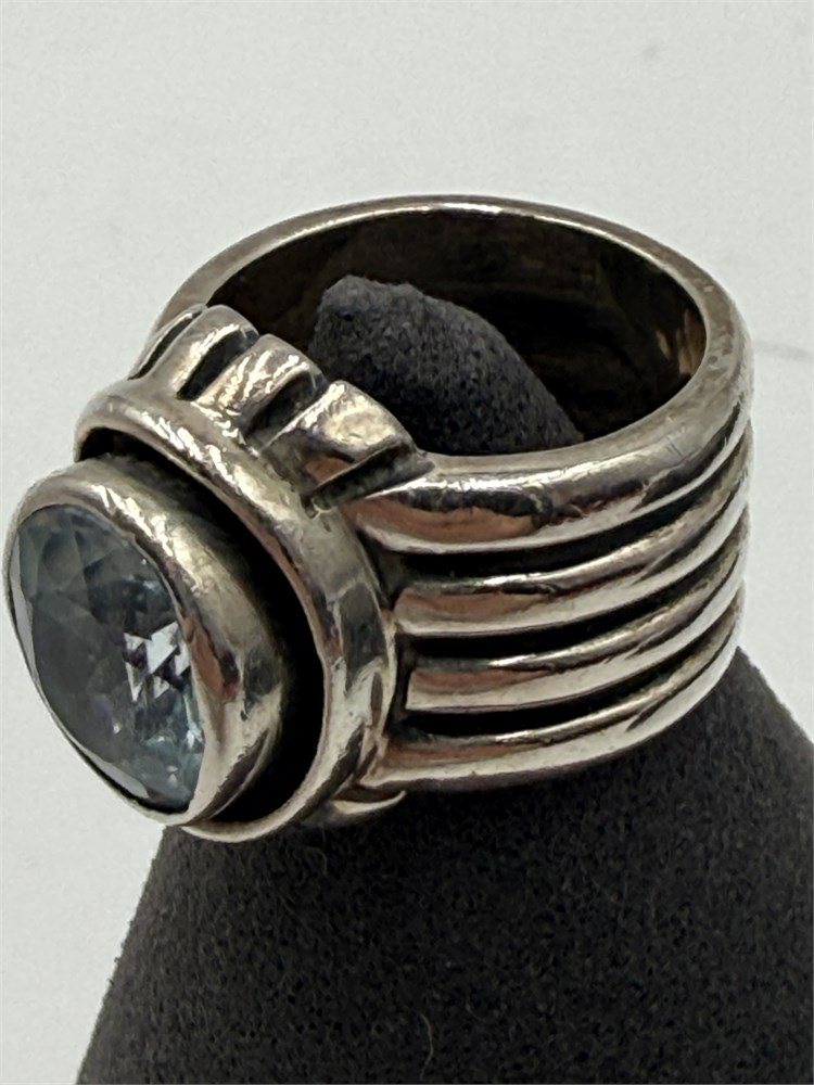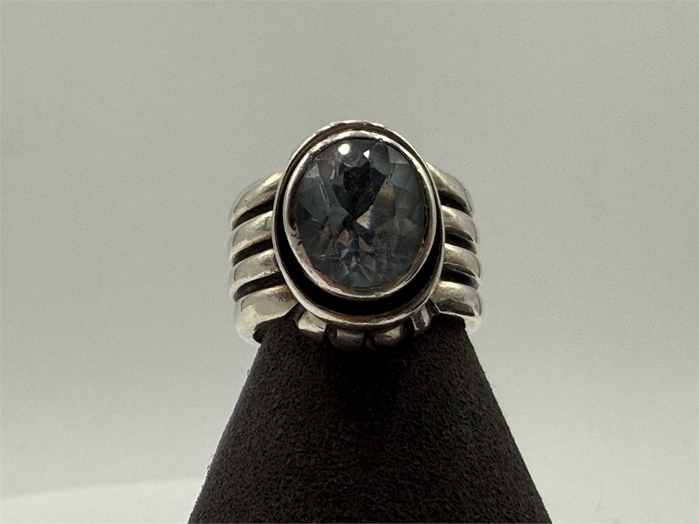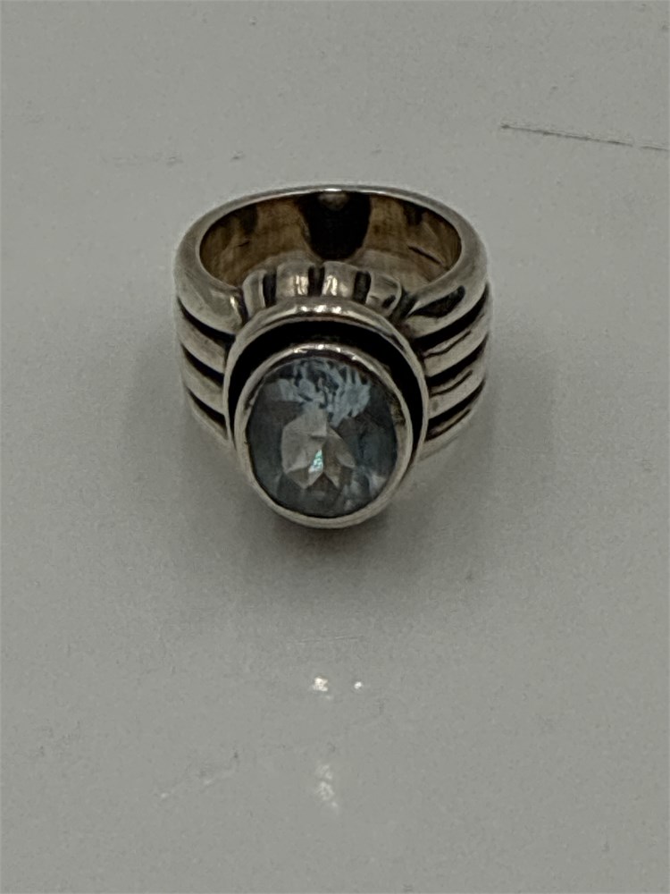 A Silpada sterling silver blue topaz ring R0902, with a ribbed band and bezel set oval large blue topaz stone. 17kg 1" Dia Good condition.