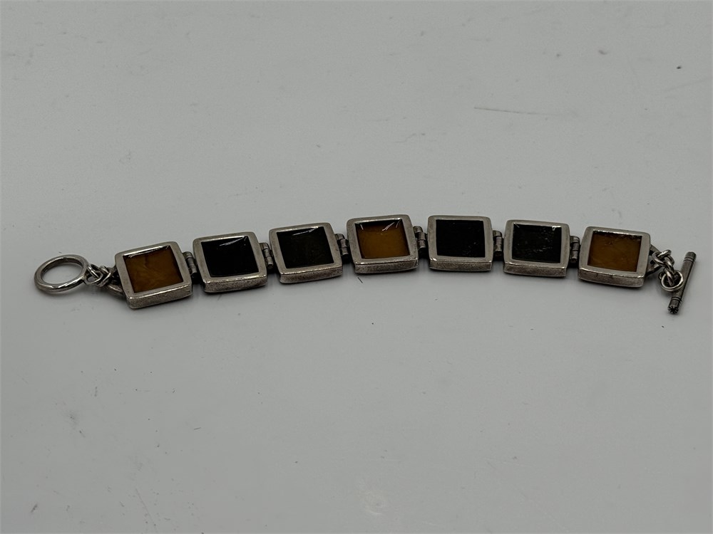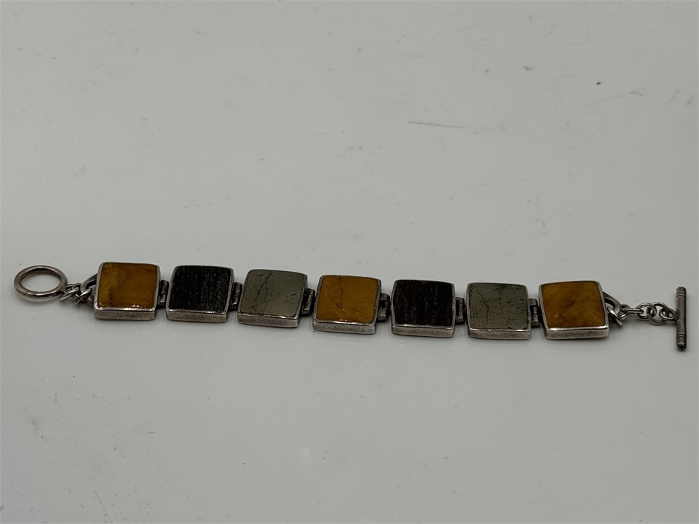 A retired Silpada B0999 sterling silver bracelet featuring pyrite, bronzite, and yellow jasper stones with a toggle clasp. 8" L Good condition. 41kg