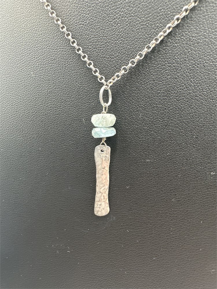 A Rockhill Designs sterling silver pendant necklace. It features two small raw aquamarine stones, and a beaten sterling silver dangle, hung on a delicate silver chain. New with original tags attached. L: 17" 4g