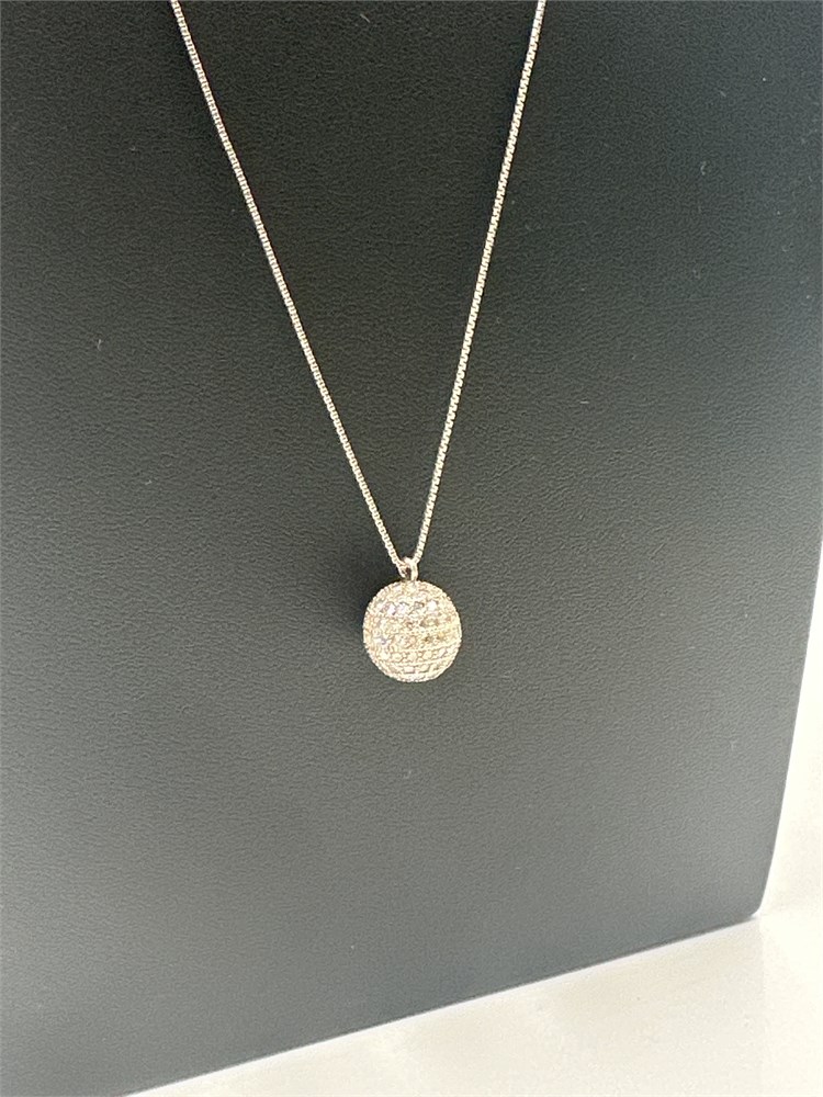 Silpada sterling silver pave "Disco Lights" pendant necklace N2818. It is a retired, 30-inch sterling silver box chain necklace featuring a 11-12mm spherical, micro-pave Cubic Zirconia pendant. Known for its high-quality 925 sterling silver construction, it has a lobster clasp and offers a sparkling, elegant design. 30" L Good condition. 6g