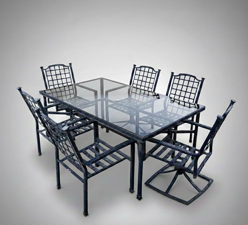 Hampton Bay 7-Piece Steel Patio Dining Set. This steel outdoor dining set features a glass tabletop with tinted glass, and gray-painted steel hardware. The set comes with 7 steel chairs with a unique "Grid Back" design that resembles a window, and one of the chairs features a swiveling base. The table measures approximately 71" x 42" x 28". This furniture set has some oxidation on the paint finish due to it being outside for years, however it is still functional and intact.