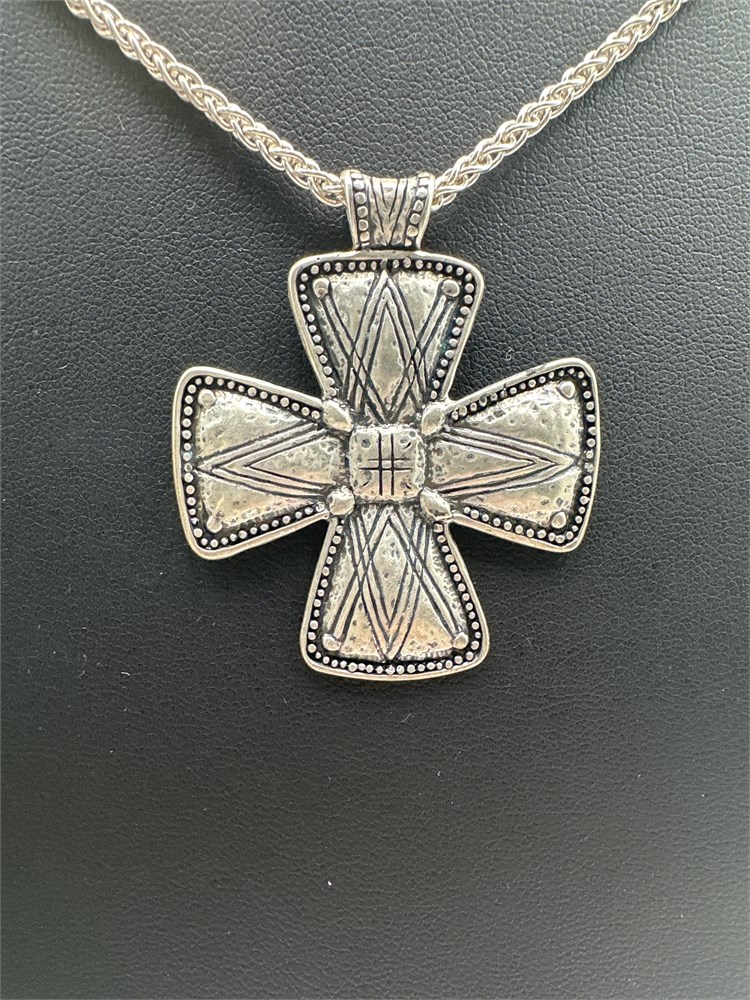 Silpada sterling silver Posh Principles etched cross statement necklace N3185. It features a large, etched cross pendant with an oxidized finish, hanging from a textured chain. The pendant has a detailed design with geometric lines and small dotted accents. The necklace secures with a lobster claw clasp. 31" L Good condition. 24g