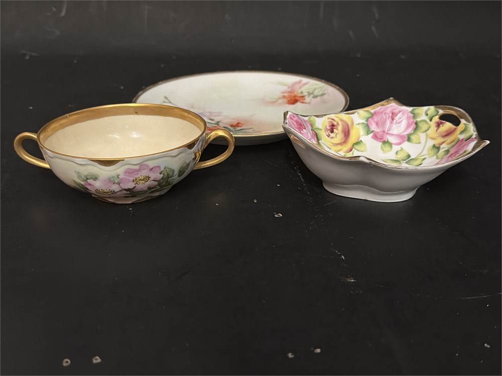 A set of hand-painted porcelain bowls and a teacup. The items are decorated with a floral motif in pink, green, and orange and feature gold-gilt rims. The set includes one large round plate by Haviland, one small boat-shaped bowl by Noritake, and one teacup with two handles by Florentia, Italy. The design is characteristic of early 20th-century decorative styles. Plate: 8 1/2" Dia; Dish: 6" Dia; Bowl: 5" Dia Good condition.