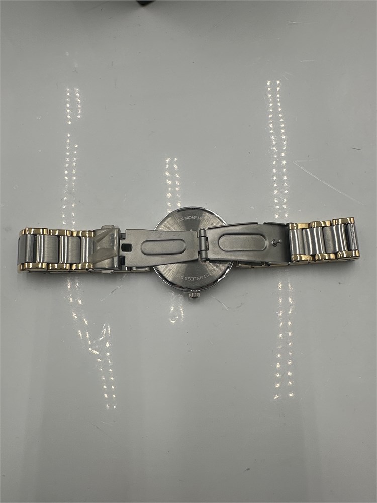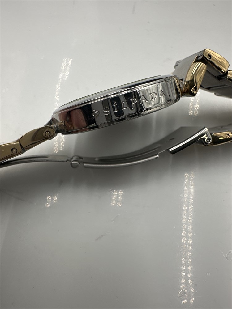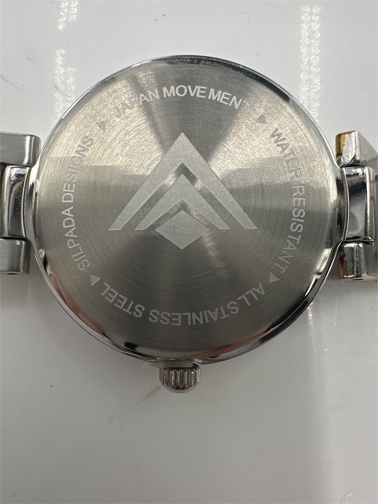 A Silpada Time to Celebrate watch T3202; a two-tone stainless steel ladies' wristwatch. It features a single deployment button clasp and Roman numerals on the dial. The watch is water-resistant and has removable links for size adjustment. 7" L Good condition.