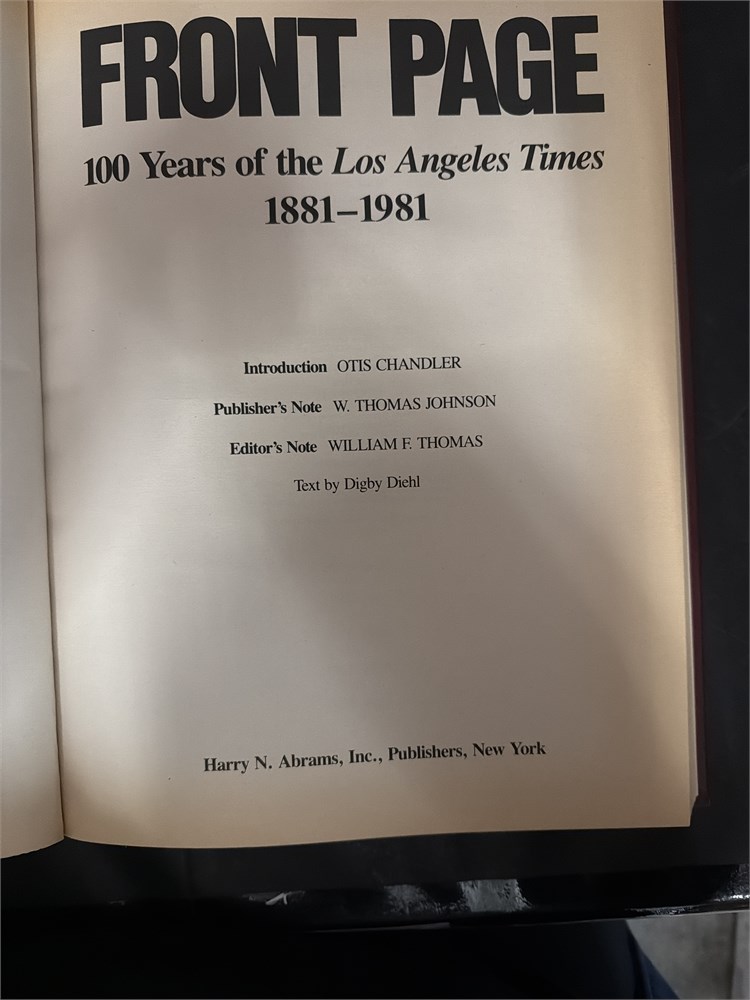 A book titled "Front Page: 100 Years of the Los Angeles Times, 1881-1981". Harry N. Abrams, Inc., Publishers, New York. Text by Digby Diehl; introduction by Otis Chandler. 31" x 15" Good condition.