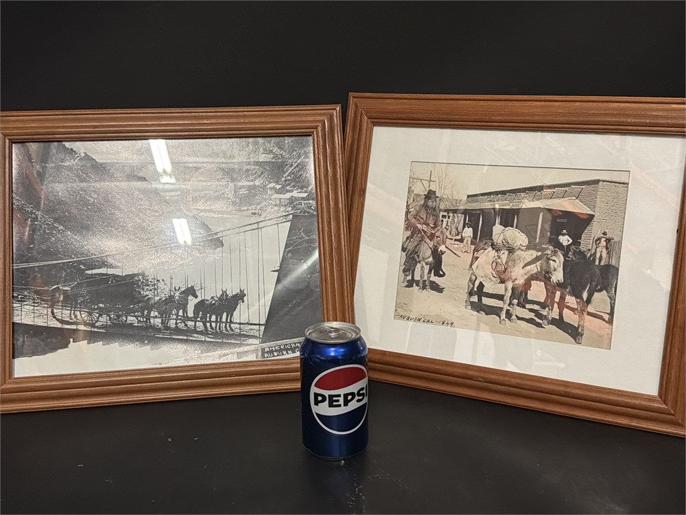Two framed historical photos. The first shows a mule team crossing a suspension bridge over the American River near Auburn, California, likely the Kaibab Suspension Bridge. The concrete arch bridge in the background is the Mountain Quarries Railroad Bridge, built in 1912. The suspension bridge was later replaced or upgraded as part of infrastructure development. The second historical photograph, shows a prospecting outfit leaving a town. The image depicts several men with pack burros loaded with supplies, a common sight during the mining era in the American West. The text on the photograph says "Auburn Cal 1849". The burros are ancestors of those left behind by miners and can still be found roaming freely in places like Oatman, Arizona, today. Both have wood frames. 17” x 14” Good condition.