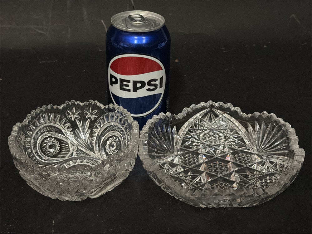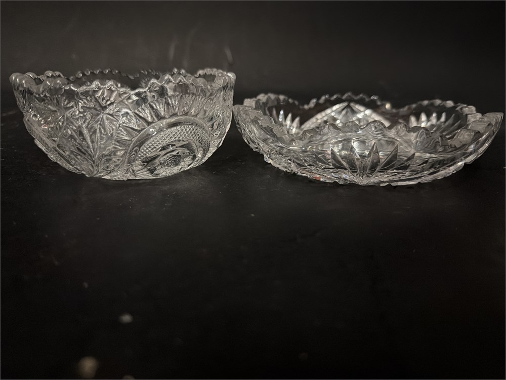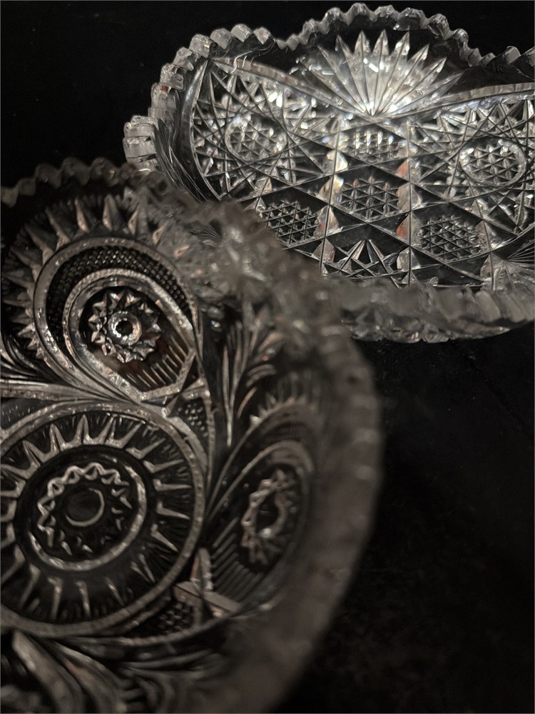 A pair of vntage American Brilliant Period (ABP) cut-glass bowls, highly prized by collectors. They likely date from the late 19th to early 20th century. The bowls feature intricate, hand-cut designs, including hobstars, hobnail, and fan motifs, with distinctive sawtooth edges. The American Brilliant Period (1876–1917) showcased American glass as the best in the world for its exceptional quality and craftsmanship. Original works from this era are considered valuable collectibles. Larger dish: 6" Dia; Smaller dish: 4 1/2" Dia Good condition.