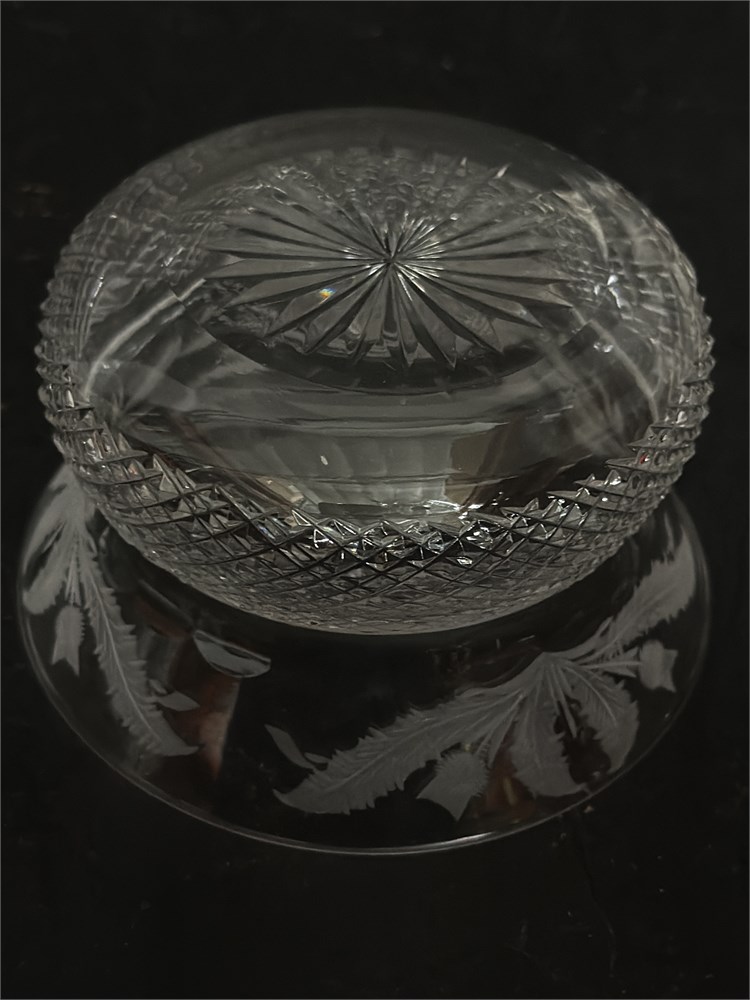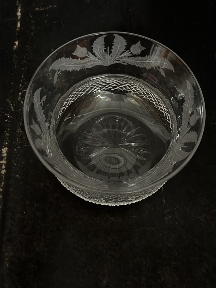 An Edinburgh Crystal Thistle cut finger bowl. The bowl is crafted from blown glass and features crosshatch decoration and thistle engravings. It was crafted in Scotland or England and is a discontinued piece. 25" Dia x 3" H Good condition.