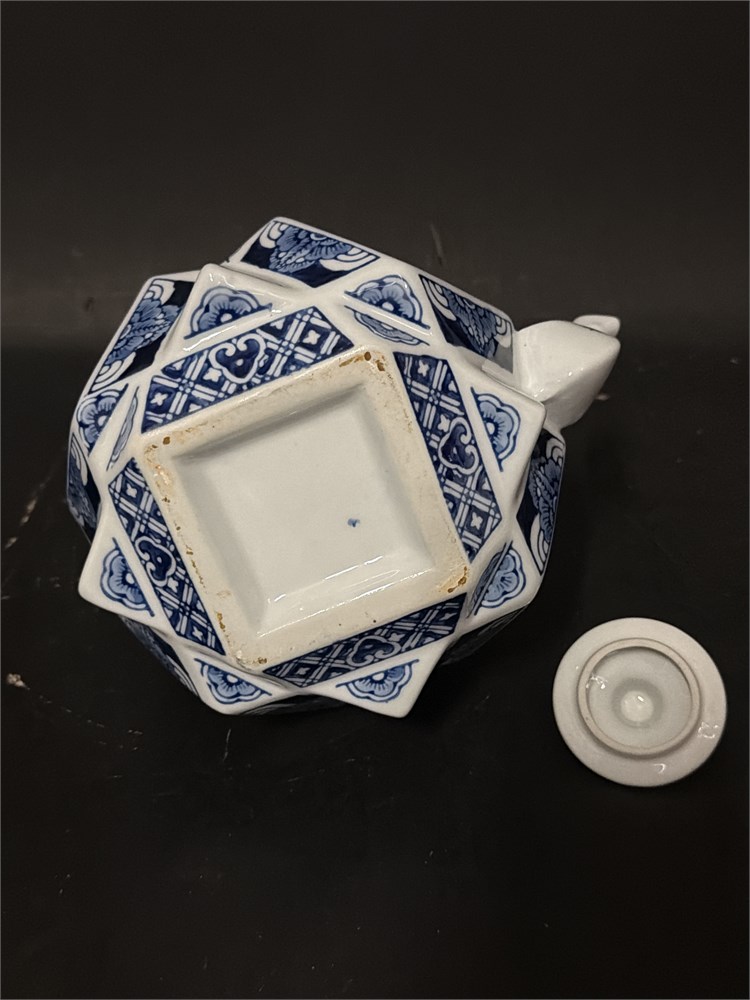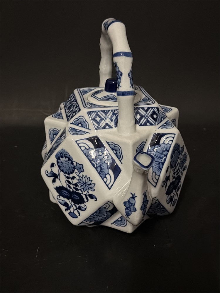 A Smithsonian replica Chinese blue and white porcelain teapot, often referred to as a "folded paper" or "origami" teapot due to its unique geometric, abstract shape. The teapot typically features hand-painted floral motifs or dragons in a traditional cobalt blue glaze. It has an unusual geometric, octagonal, or abstract shape meant to resemble folded paper. It comes with an applied basket-style porcelain handle. 9 1/2" H x 9 1/2" W Good condition.