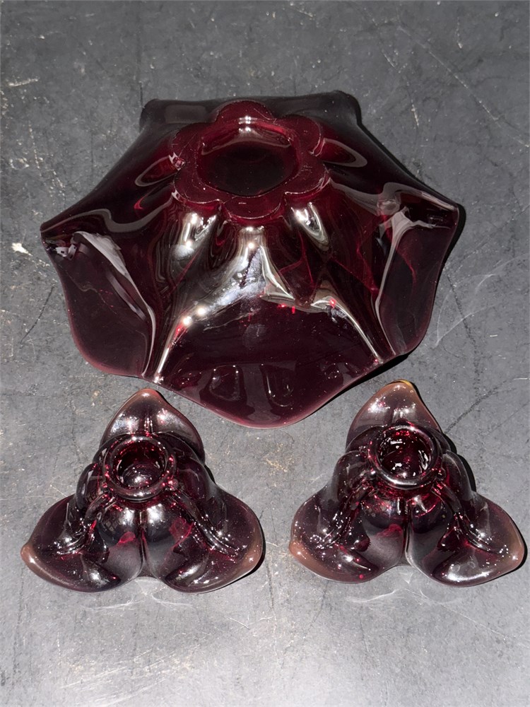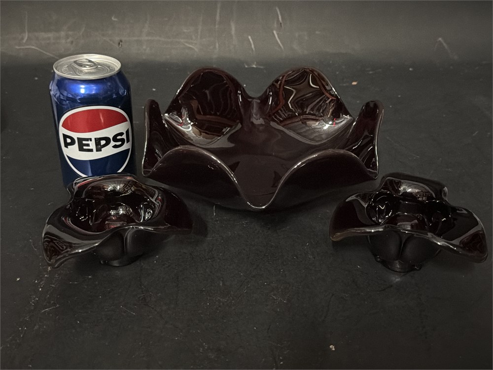 A set of amethyst or black glass items, including a central bowl and two matching smaller pieces that are candle holders or small dishes. The pieces feature a distinctive "ruffled" or "handkerchief" design, which is a style often found in mid-century modern (MCM) glassware. This particular deep purple color is frequently referred to in vintage markets as black amethyst glass because it appears black until held up to the light, which reveals its true purple hue. Large bowl: 8 1/2" Dia; Flower: 3" Dia Good condition.