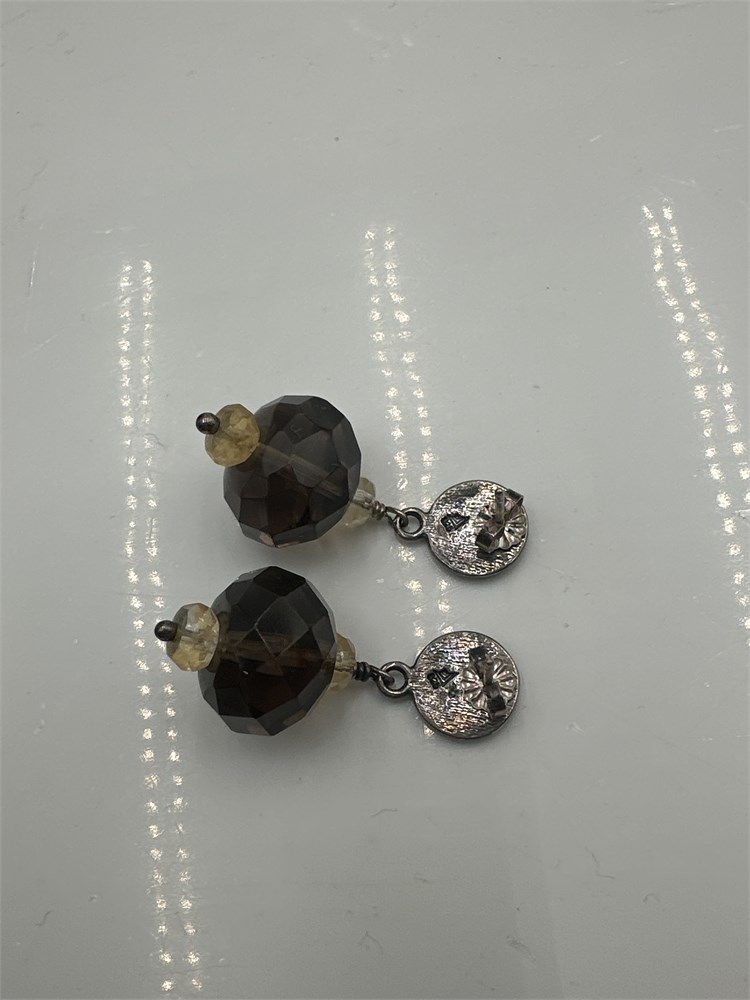 A pair of Silpada oxidized sterling silver faceted smoky quartz & citrine earrings model P1419. they feature sterling silver hooks, smoky quartz dangles, and citrine accents. 1.31" L Good condition. 12g Good condition.