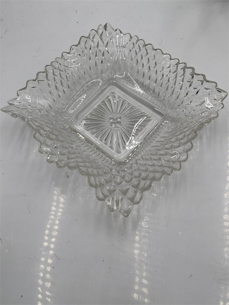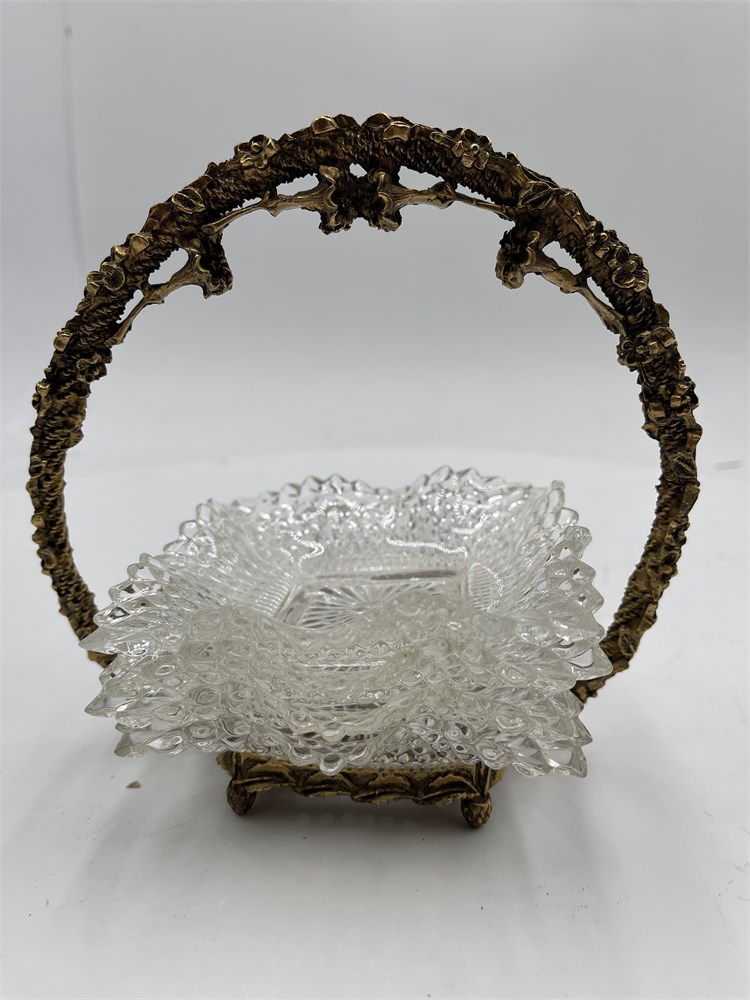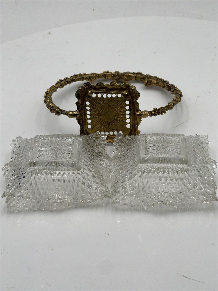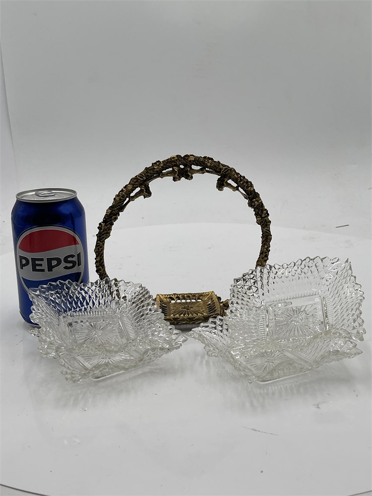A floral brass stand holding 4 Indiana Glass diamond point nut dishes with a ruffled rim. It is a vintage floral brass basket stand, designed to hold ruffled glass dishes, often referred to as a "bride's basket". The metal frame features an ornate, floral filigree design on the handle and base. Little plates: 4" x 4" Good condition.