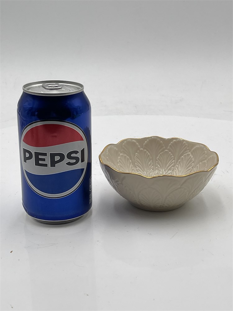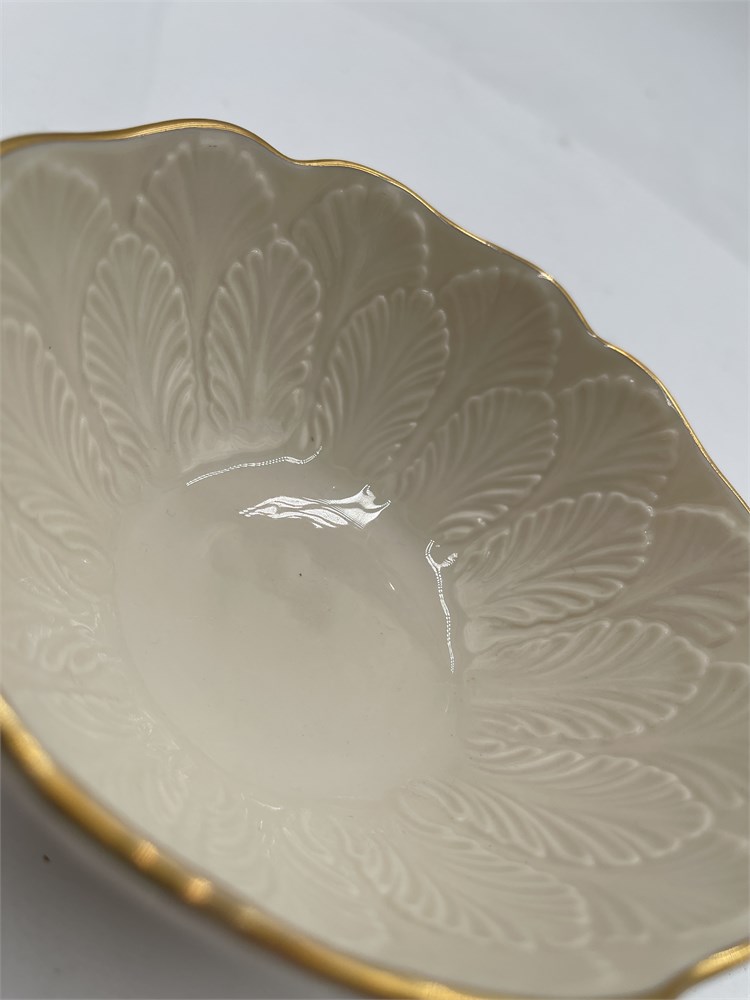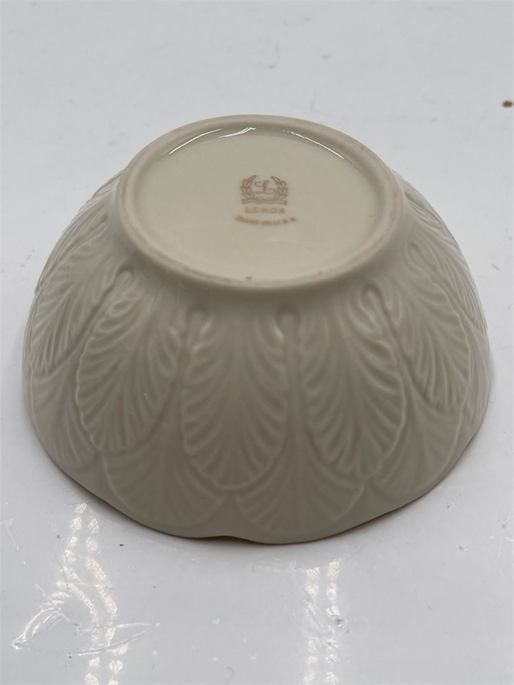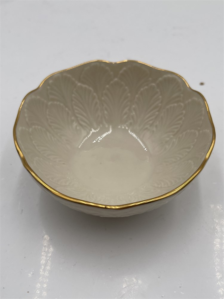 A Lenox Greenfield Bon Bon Bowl, a vintage piece known for its ivory china and distinctive scalloped rim. The bowl features a raised leaf pattern embossed on both the interior and exterior sides. It is finished with a 24-karat gold trimmed scalloped rim. It is often used as a candy dish, nut bowl, or for serving "bon bons". 2" H x 4 1/2" Dia Good condition.