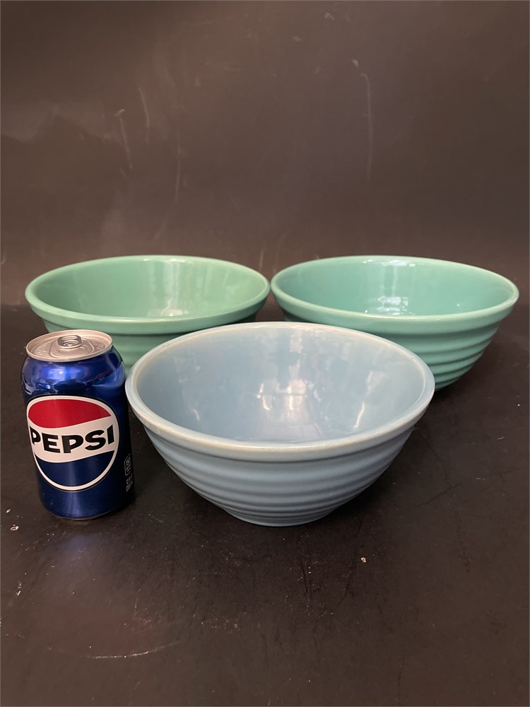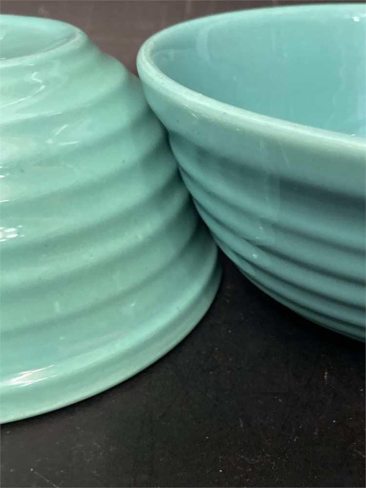 A set of three light blue/green bowls with a distinctive horizontal ribbed design, which is a hallmark of Bauer Ringware pottery. These bowls are Bauer Ringware mixing bowls or potentially smaller fruit/salsa bowls, depending on their size. The Ringware line, introduced by Bauer Pottery in the 1930s, is highly collectible for its vibrant glazes and "beehive" ribbed texture. Large bowl: 9 1/2" Dia x 4 1/2" H; Small bowl: 8 1/2" Dia x 4" H Good condition.