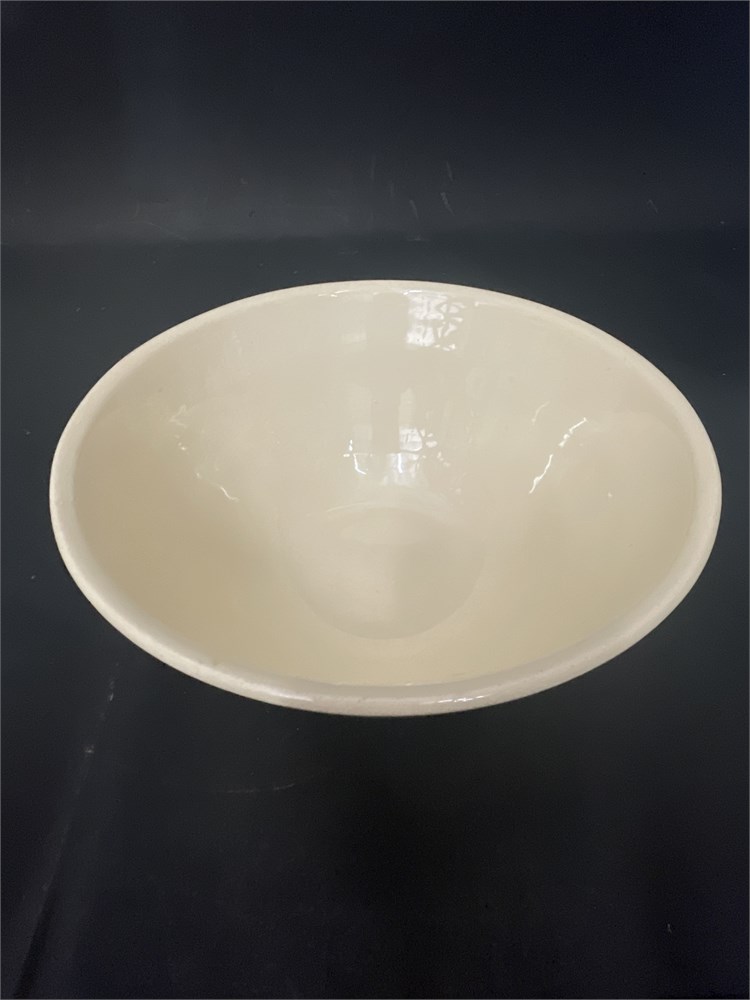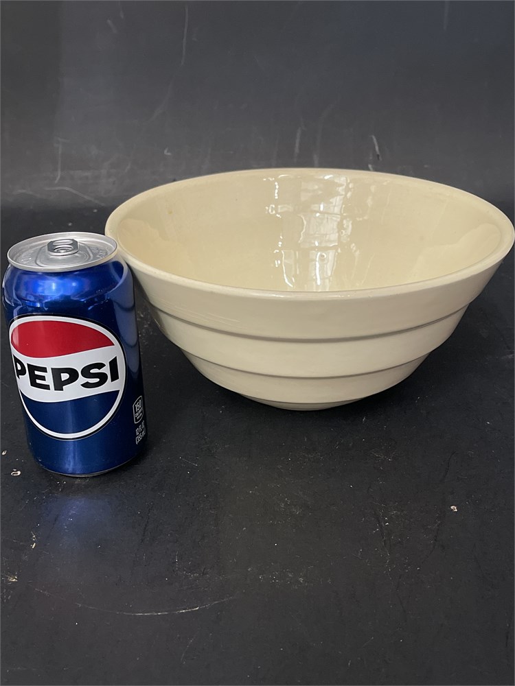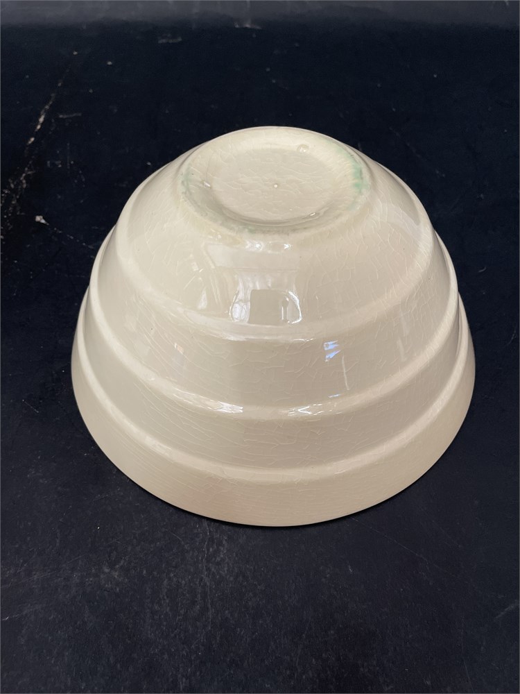 Cream tapered bowl with distinct horizontal ribbing or grooves along its exterior. It is a round, deep bowl with a wide rim that tapers down to a smaller, stable base. It is made from high-quality vitrified porcelain, which gives it a smooth, glossy finish and high resistance to chipping or staining. 1/2" Dia x 4 1/2" H Good condition.