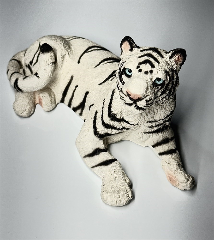 Beautifully detailed white tiger figurine featuring lifelike sculpting and hand-painted accents. The piece shows a reclining white tiger with black striping, blue eyes, and realistic fur texture throughout. A strong decorative example suited for collectors, shelf display, or wildlife-themed décor.