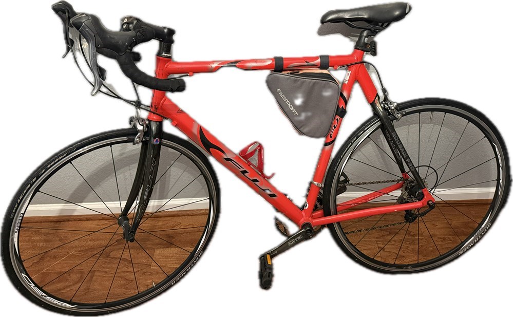 Equipped with drop handlebars, Shimano drivetrain components, and road slick tires, this bike delivers efficient power transfer and comfortable long-distance performance. Includes a frame-mounted storage pouch and water bottle cage as shown.