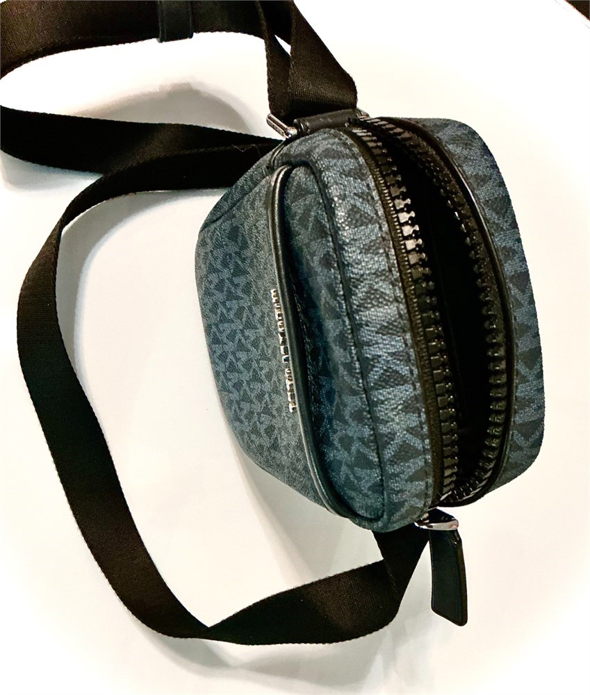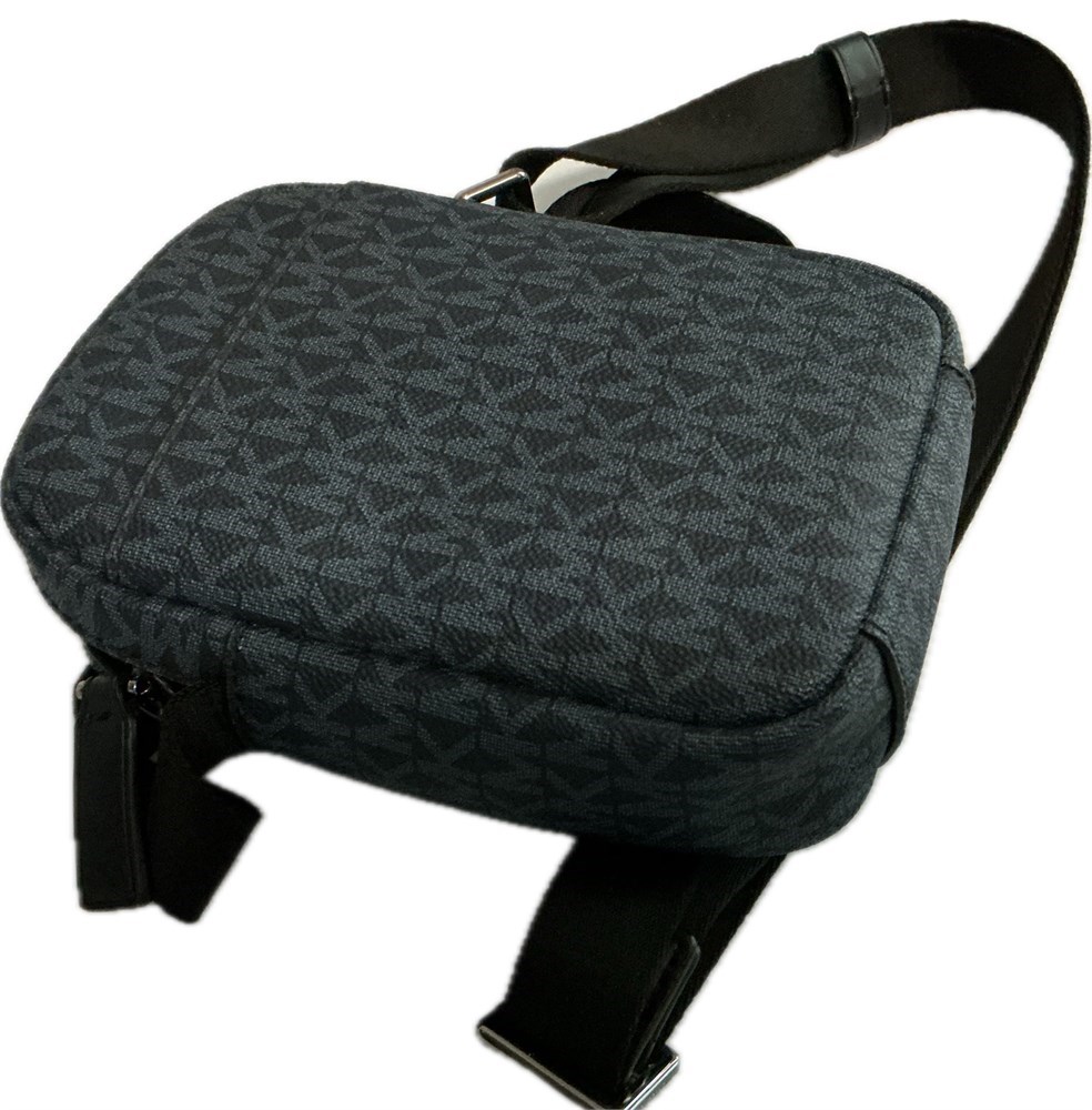 Authentic Michael Kors crossbody bag featuring the classic MK logo signature pattern in a dark charcoal/black colorway. This compact yet functional bag includes a zip-top main compartment, front slip pocket, and an adjustable crossbody strap for comfortable everyday wear.