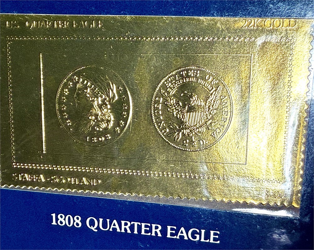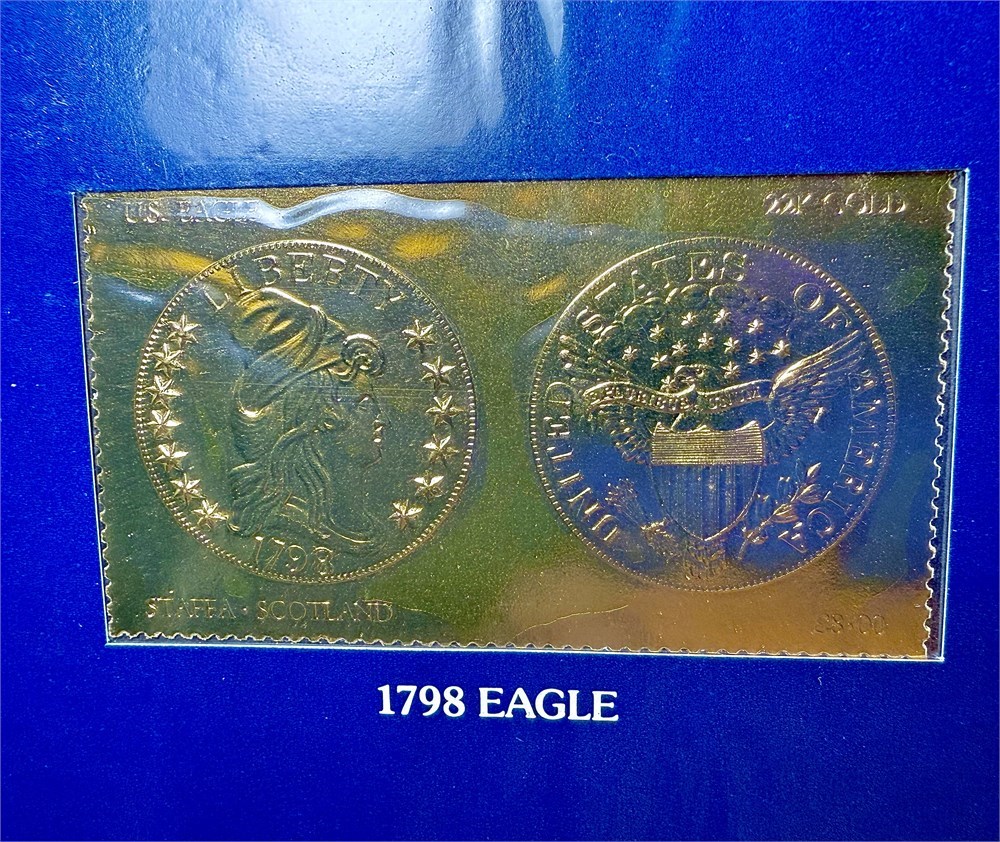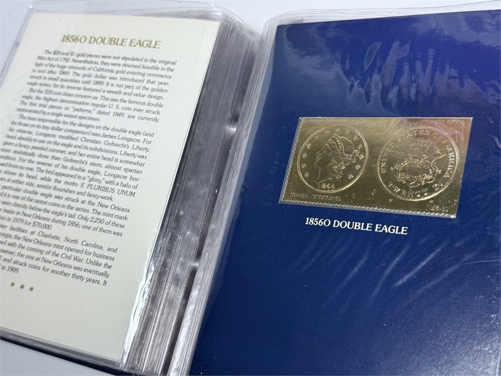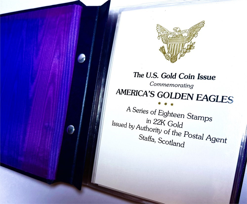 This set consists of eighteen (18) individual gold foil stamps, each depicting iconic American gold coinage such as the 1798 Half Eagle, housed in its original deluxe presentation binder with protective sleeves.