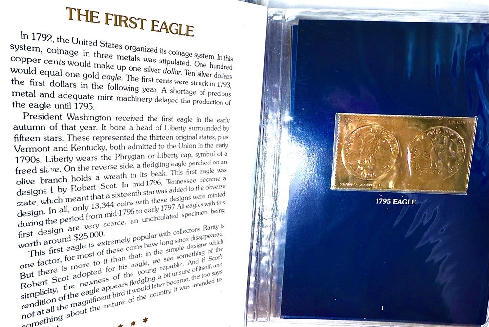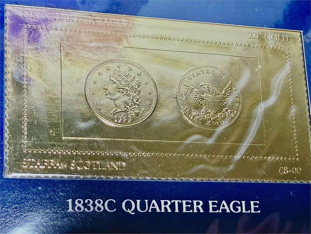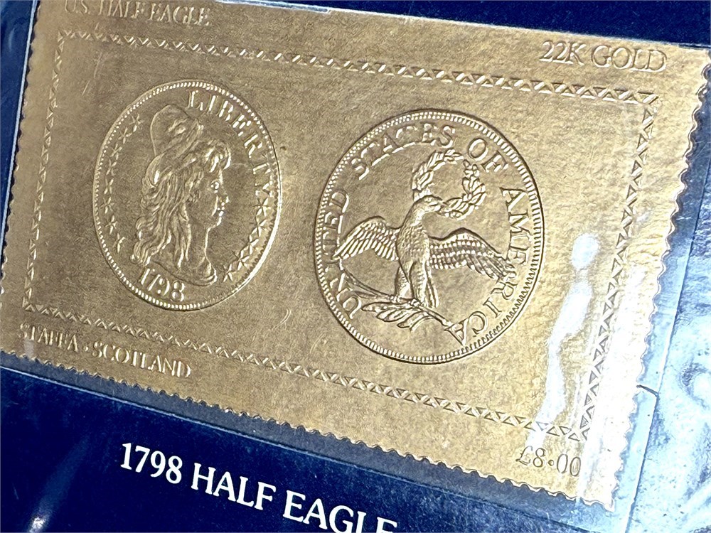 Offered is “America’s Golden Eagles” – The U.S. Gold Coin Issue, a beautifully presented collector stamp set commemorating classic U.S. gold coin designs, produced in 22-karat gold foil stamps.