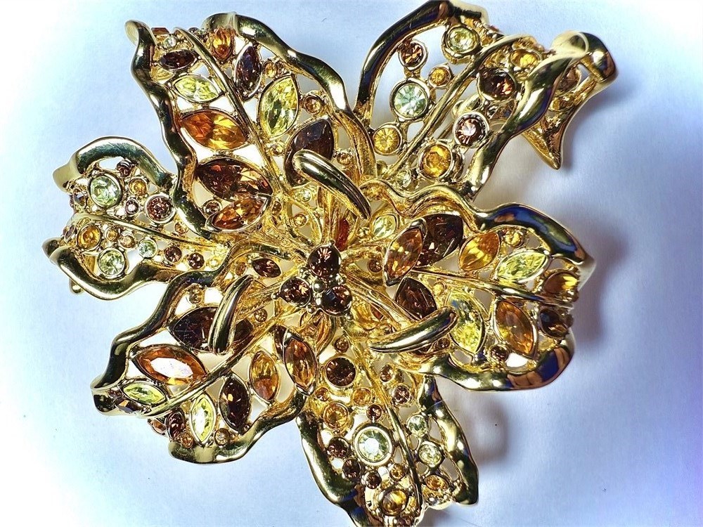 • Material: Gold-tone metal with glass or crystal rhinestones in various shades of amber, gold, and clear
