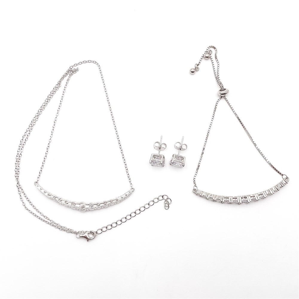 Jewelry set includes a bar necklace, adjustable bracelet, and stud earrings crafted from 925 sterling silver with cubic zirconia accents. Necklace and bracelet feature bar designs, while earrings have a solitaire setting. Condition is good.