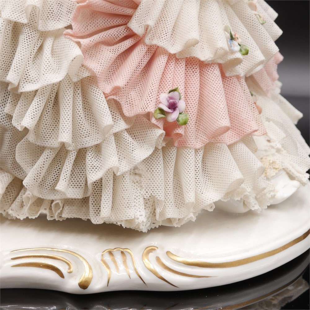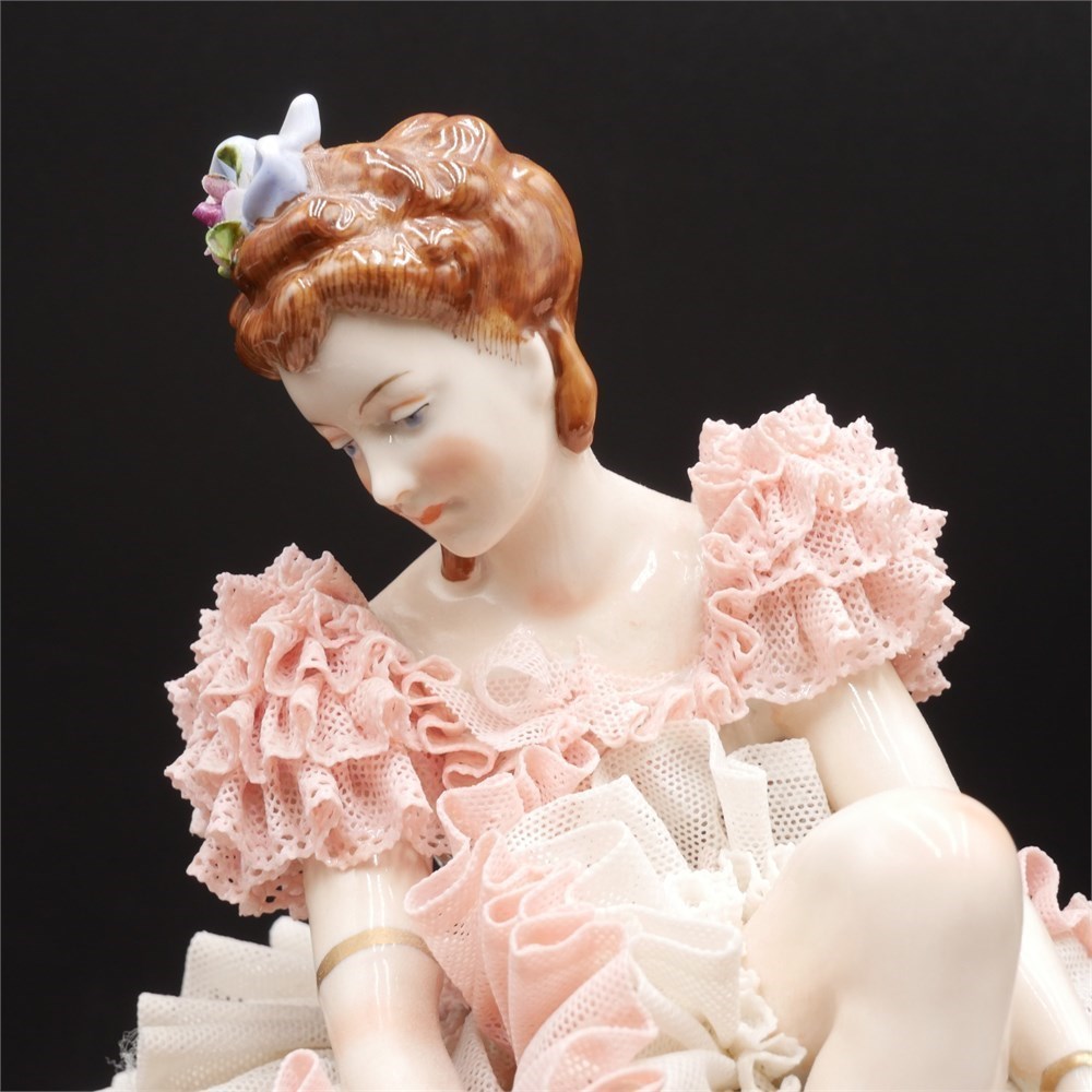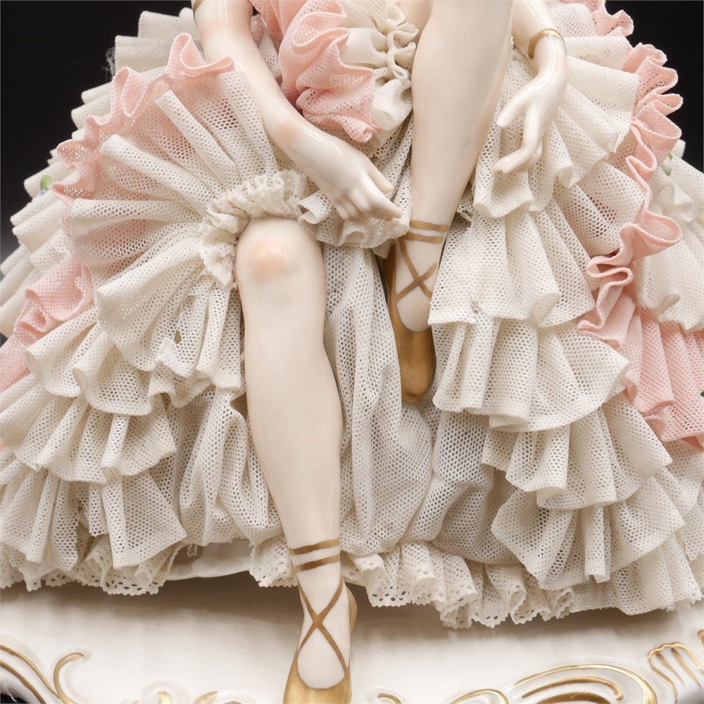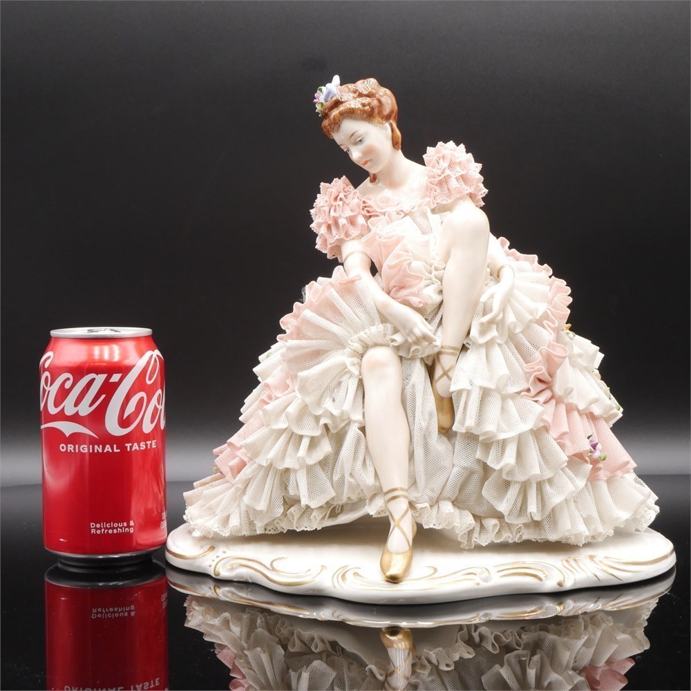 This porcelain figurine depicts a seated ballerina tying her golden pointe ballet shoes, adorned with flowers in her hair and crafted using the Dresden lace technique. Made in Germany. The figurine measures approximately 10.5 inches long, 10.5 inches high, and 7.75 inches wide, and is in good condition.