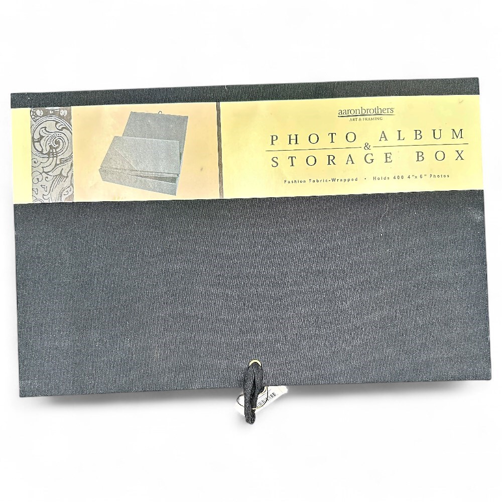 A photo album and storage box from Aaron Brothers Art & Framing. This archival-style clamshell box is wrapped in a durable, black textured fabric and is designed to hold up to 400 4x6 inch photos. The original paper belly band and retail tag are still attached. The item's measurements are 15 in x 9 in x 3 in. The item is in good, new old stock (NOS) condition, appearing unused.