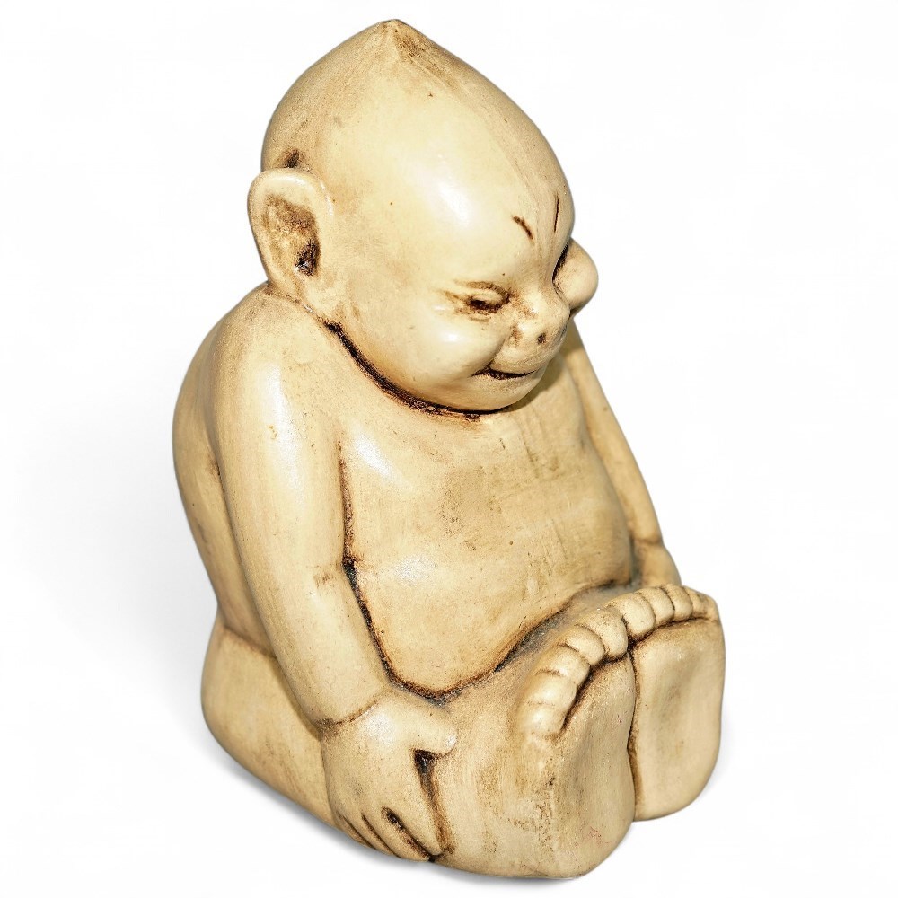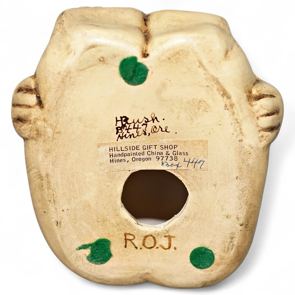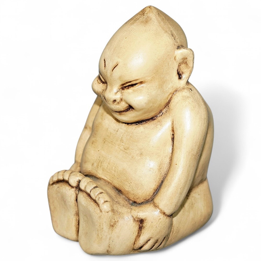 A vintage ceramic figurine Billiken, a chubby little imp with a pointy head who looks like a cross between a kewpie doll and a troll. Created by Florence Pretz at the turn of the 20th century, the character appeared to Florence in a dream and came into being as the “God of Things as They Ought to Be." Billiken is the physical embodiment of positive vibes, as evidenced by his slogans — “Grin and begin to win” and “As long as I smile at you, bad luck can’t harm you.” And the superstition is that if you rub his belly or feet, he brings you good luck. marked on underside " H Rush" and "R.O.J." with a tag from the Hillside Gift Shop in Hines, Oregon. Measures 6.5" x 3.5" x 4" and is in good condition.