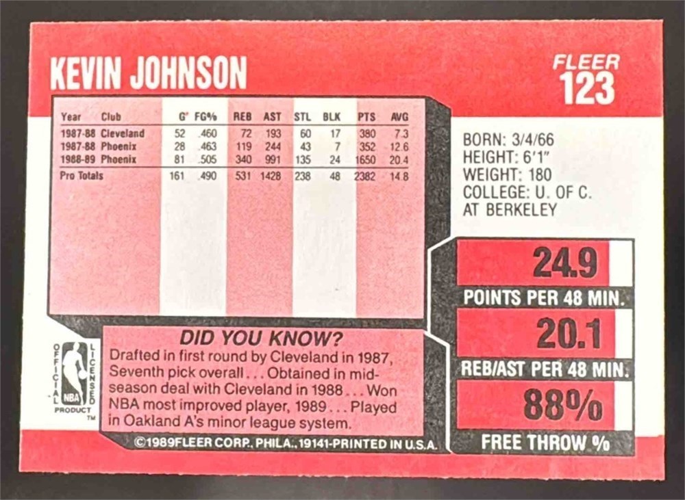 1989-90 Fleer Basketball Kevin Johnson #123 RC Phoenix Suns View Watchlist >