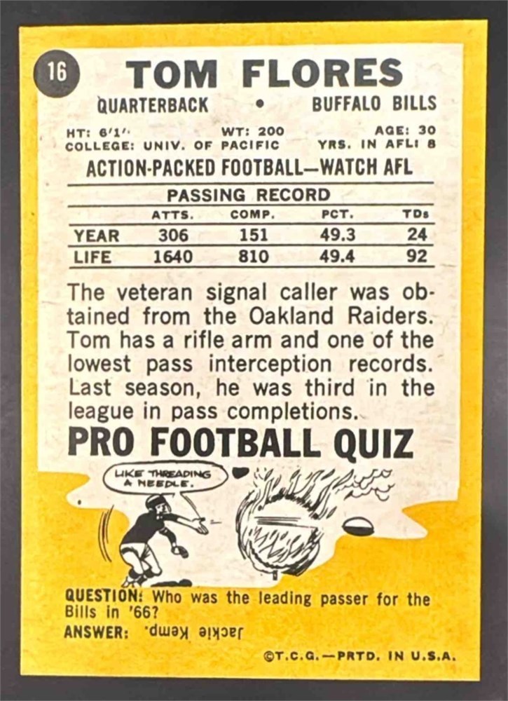 1967 Topps Football Tom Flores #16 Buffalo Bills