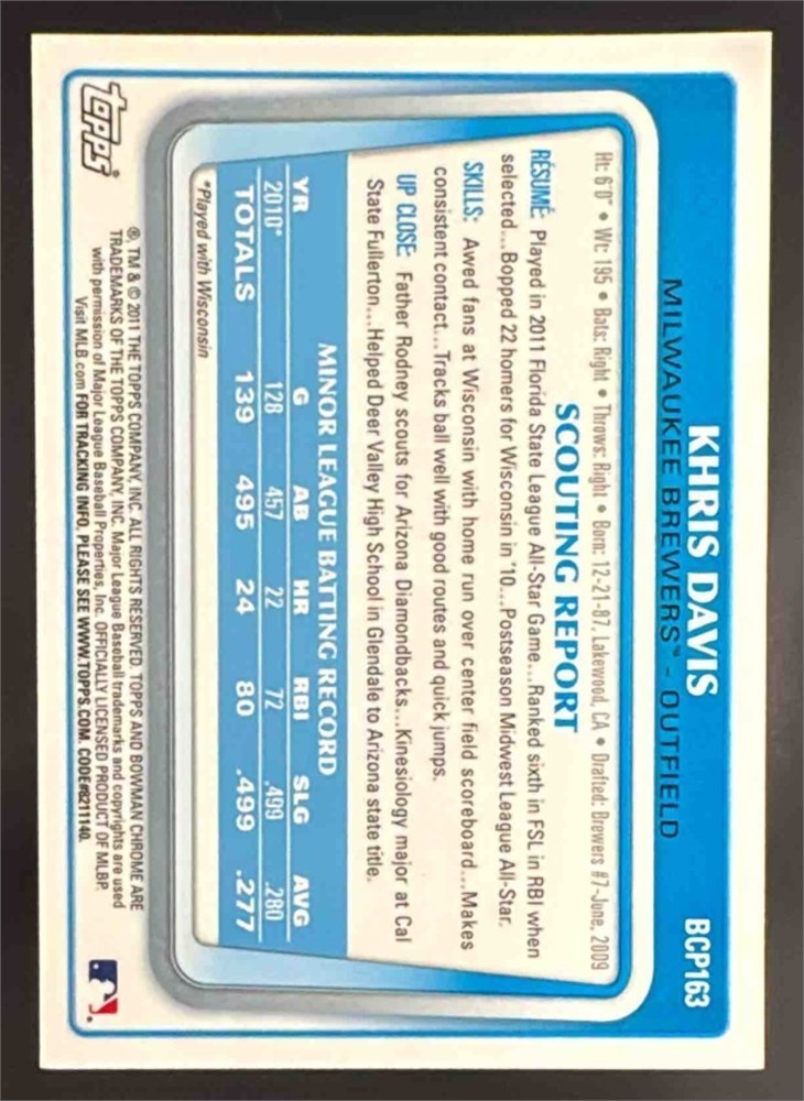 2011 Bowman Chrome Khris Davis #BCP163 Prospect Autographs Auto Brewers View Watchlist >