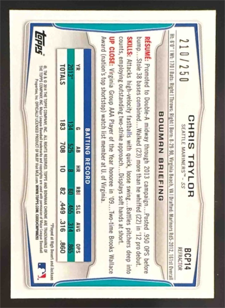 2014 Bowman Chris Taylor #BCP14 Chrome Prospects Blue Refractors /250 RC View Watchlist >