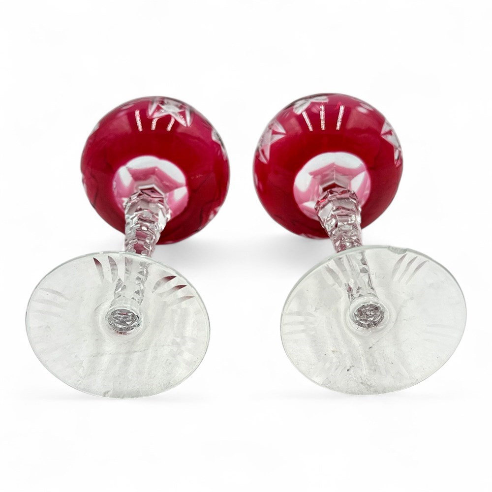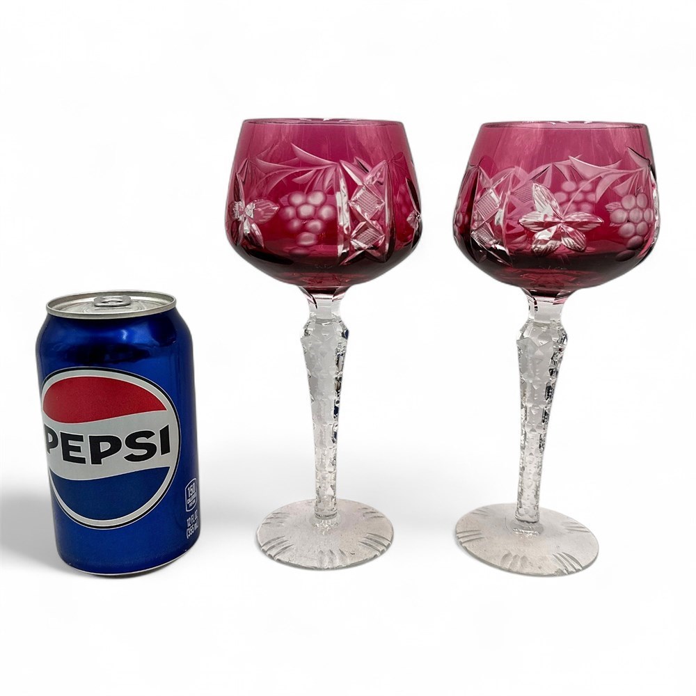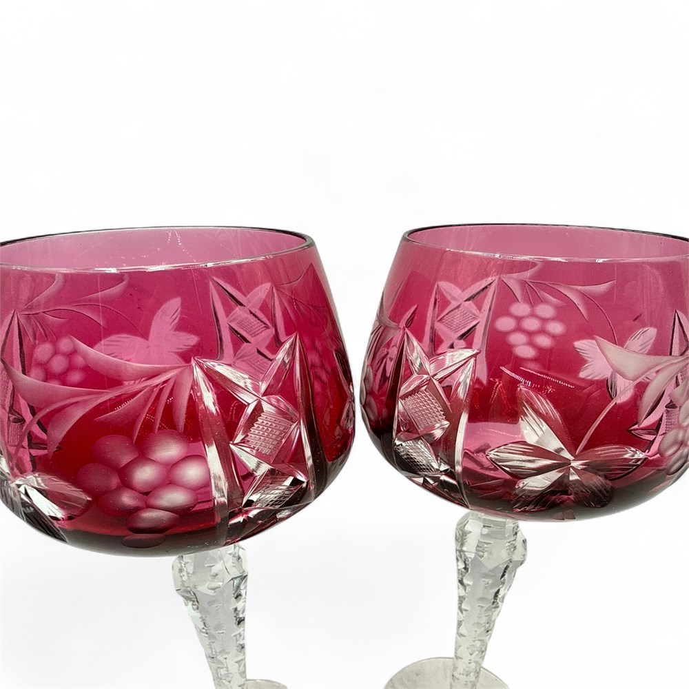 A pair of Lausitzer Bleikristall (lead crystal) cut-to-clear hock wine glasses in a ruby or cranberry red color, featuring a popular grapevine pattern. The glasses are made of 24% lead crystal, which gives them clarity, brilliance, and a pleasant ringing tone when tapped. They feature a "cut-to-clear" design, where a layer of colored glass (ruby red) is applied over clear crystal and then hand-cut to create a detailed grapevine motif of grapes and leaves, exposing the clear crystal beneath. These are hock wine glasses (or Römer glasses), which are traditionally used for German wines. They have a tall, notched, clear stem with a multi-sided cut design. 8" H x 3.5" Dia (widest point); Opening: 2.5" Dia Please note: small chip missing at base of one glass.