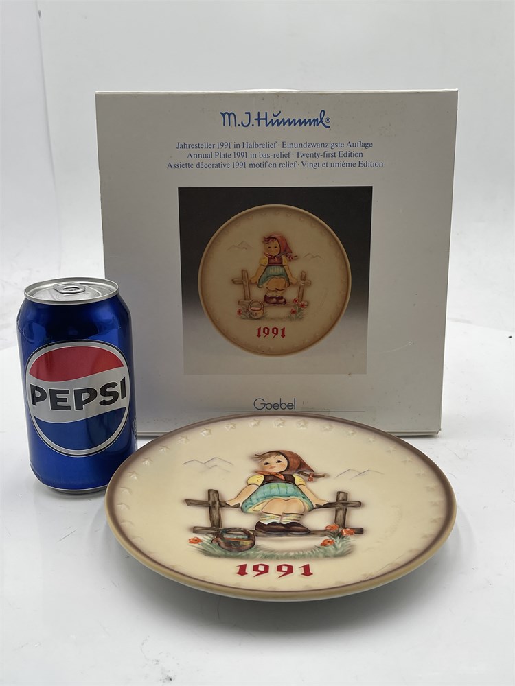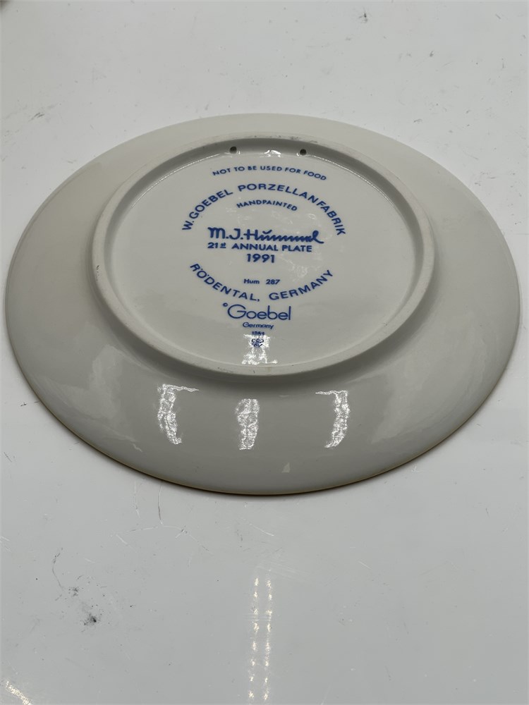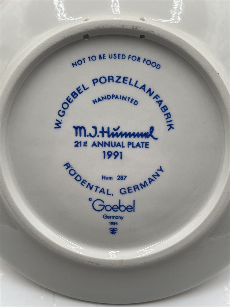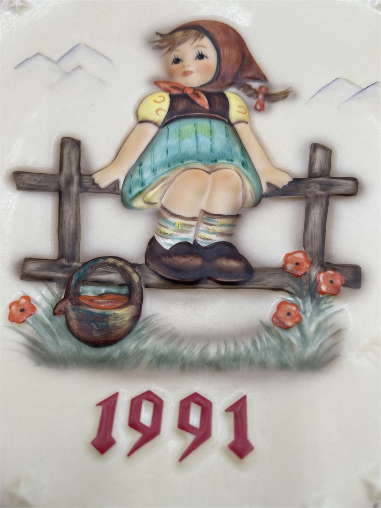 A W. Goebel Porzellanfabrik hand-painted porcelain annual plate, model Hum 287, titled "Just Resting," depicting in bas-relief a young girl seated on a fence with a basket — a motif drawn from the original artwork of Sister Maria Innocentia Hummel (1909–1946). The 21st edition in the Annual Plate series, which Goebel inaugurates in 1971 to mark the centenary of the factory's founding, this example measures approximately 7.5 inches (19 cm) in diameter and features a matte cream ground with multicolor hand-painted decoration in red, green, yellow, and brown tones. The rim carries the series' characteristic border of 33 embossed stars. The obverse is incised with the M.J. Hummel signature at right; the verso bears the printed blue M.J. Hummel and Goebel marks, trilingual edition text ("Jahresteller 1991 / Annual Plate 1991 / Assiette décorative 1991"), the factory designation "W. Goebel Porzellanfabrik, Rödental, Germany," a 1984 design copyright date, and a pierced rim for wall display. The backstamp reading "Germany" rather than "West Germany" reflects the TMK-7 (Hummel Mark) trademark introduced in 1991 following German reunification. Offered with its original box. The plate is in apparently excellent condition with no visible chips, cracks, or paint loss; the box exhibits minor shelf wear and light discoloration consistent with storage.