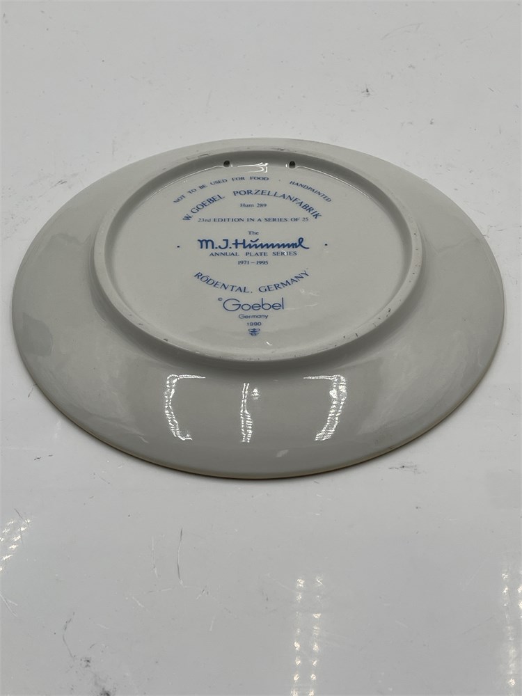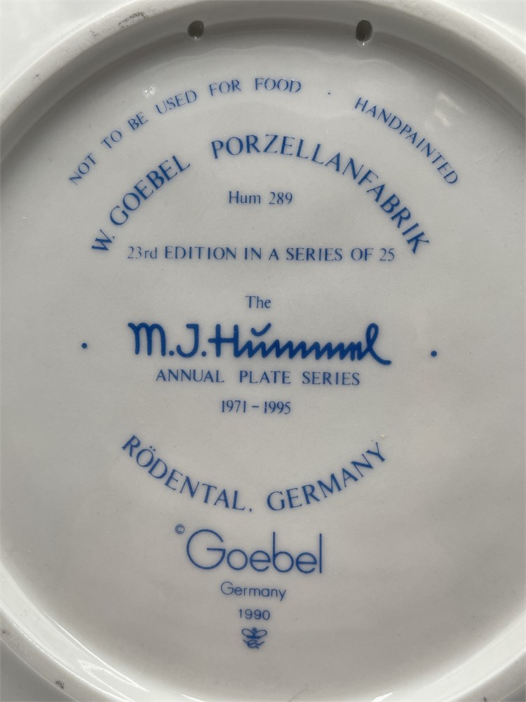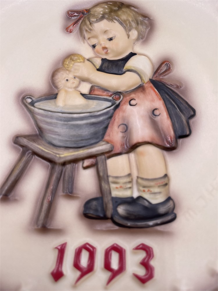 A hand-painted bas-relief porcelain collector plate by W. Goebel Porzellanfabrik of Rödental, Germany, model Hum 289, titled "Doll Bath" (German: "Puppenbad"), dated 1993. This is the 23rd edition in the M.J. Hummel Annual Plate Series of 25, produced from 1971 to 1995 — a series launched to commemorate the centenary of the Goebel factory. The design, based on the original artwork of Sister Maria Innocentia Hummel (Berta Hummel, 1909–1946), depicts a young girl bathing a doll in a washtub, rendered in polychrome earth tones with a matte finish. The rim features raised star motifs. The obverse bears the incised "M.J. Hummel" signature and the date "1993" in relief. The reverse is marked "W. Goebel Porzellanfabrik," "Rödental, Germany," "Hum 289," "23rd Edition in a Series of 25," "The M.J. Hummel Annual Plate Series 1971–1995," "Handpainted," "Not to Be Used for Food," and "1990," along with the Goebel TMK-7 trademark (the Reunification Mark, used 1990–1999). The pierced foot rim allows for wall hanging without additional hardware. Diameter: 7½ inches. Accompanied by the original trilingual box. Condition: good overall with normal signs of handling wear consistent with age; no significant chips, cracks, or paint loss observed.