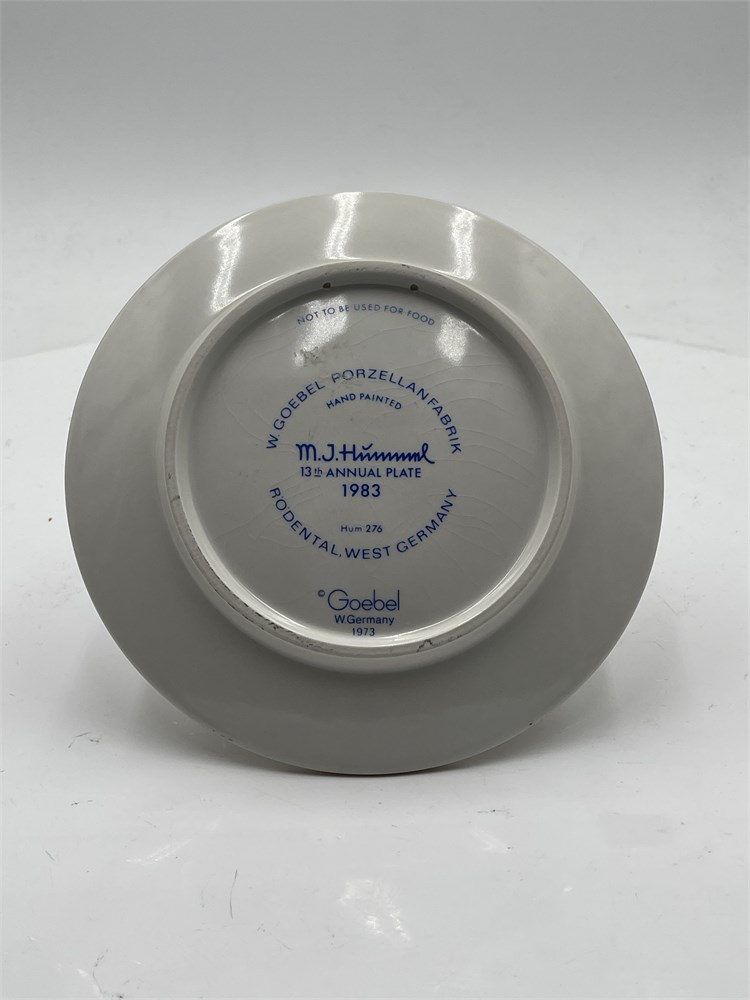 A W. Goebel Porzellanfabrik M.J. Hummel 13th Annual Plate, model Hum 276, titled "Postman" (Der Postbote), issued in 1983. The hand-painted porcelain plate features a bas-relief depiction of a young boy in a postman's uniform carrying a mailbag and letters, based on the original drawings of Sister Maria Innocentia Hummel (Berta Hummel), with the relief mold adapted by master sculptor Gerhard Skrobek. The cream ground is framed by a gradient rim with raised star motifs; the date "1983" appears embossed in red on the front. The reverse bears a blue underglaze backstamp reading "W. Goebel Porzellanfabrik / Rödental, West Germany," along with the incised model number Hum 276, a 1973 copyright date for the mold design, "Hand Painted," "13th Annual Plate," "© Goebel," and the advisory "Not to Be Used for Food." The trademark corresponds to TMK-6 (the "Missing Bee" mark), in use from 1979 to 1991. The plate is pierced at the foot rim for wall hanging. The Annual Plate series was inaugurated in 1971 to mark the centenary of the Goebel factory and continued through 1995; the "Postman" motif derives from a classic Hummel figurine (Hum 119) first modeled in the late 1930s. Cataloged at 7½ inches, consistent with the standard diameter for this series. Significant crazing is present throughout the glaze on both front and back surfaces.