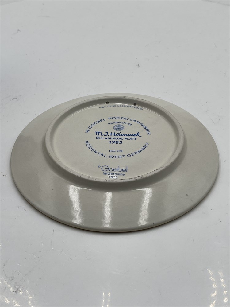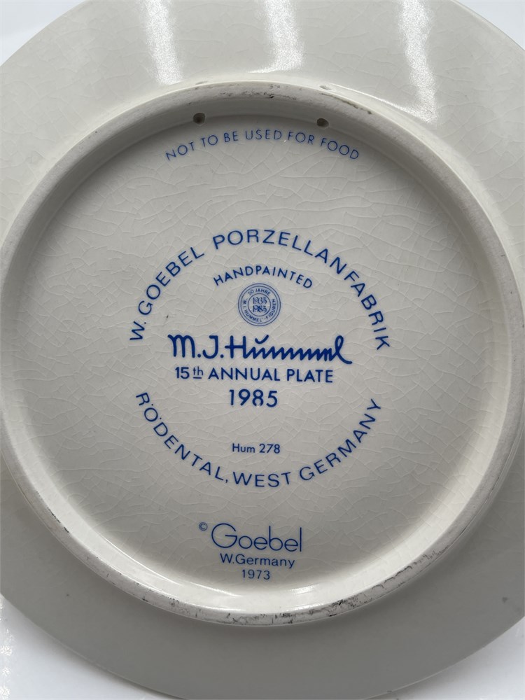 A 1985 M.I. Hummel Annual Collector Plate, 15th edition, model Hum 278, "Chick Girl," produced by W. Goebel Porzellanfabrik in Rödental, West Germany. The design, based on the original artwork of Sister Maria Innocentia Hummel (1909–1946) and the Hummel figurine #57, depicts a young girl in a red headscarf feeding chicks from a basket, rendered in polychrome bas-relief against a cream ground with an airbrushed brown-gradient rim. The plate measures approximately 7.5 inches (19 cm) in diameter and features thirty-three small raised stars encircling the outer rim, consistent with the series format. The front bears an impressed stylized "M.J. Hummel" signature at lower left. The reverse bears the blue circular Goebel backstamp ("W. Goebel Porzellanfabrik, Rödental, West Germany" / TMK-6, "The Missing Bee," in use 1979–1991), the "50 Jahre 1935–1985 M.I. Hummel-Figuren" commemorative roundel marking the 50th anniversary of Hummel figurine production, trilingual edition text (English, French, German) identifying the plate as the fifteenth edition, and additional markings including "HANDPAINTED," "NOT TO BE USED FOR FOOD," "© Goebel," and the copyright date "1973." The Annual Plate series was inaugurated in 1971 to commemorate the centenary of the Goebel factory; this 1985 issue is notable for its special anniversary backstamp. The plate was likely modeled by master sculptor Gerhard Skrobek, the principal modeler for the Goebel Hummel plate series during this period. Condition: visible crazing (fine network of surface cracks in the glaze) across the front, particularly on the cream background; accompanied by its original box. The footed base retains two pierced holes in the rear rim for wall display.