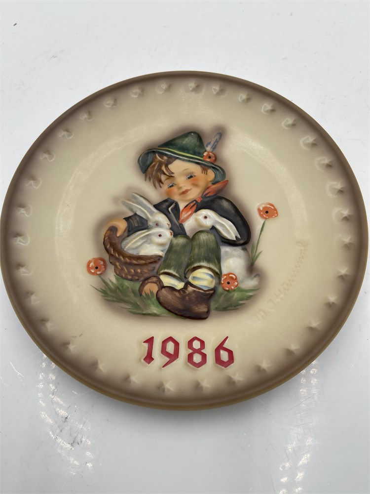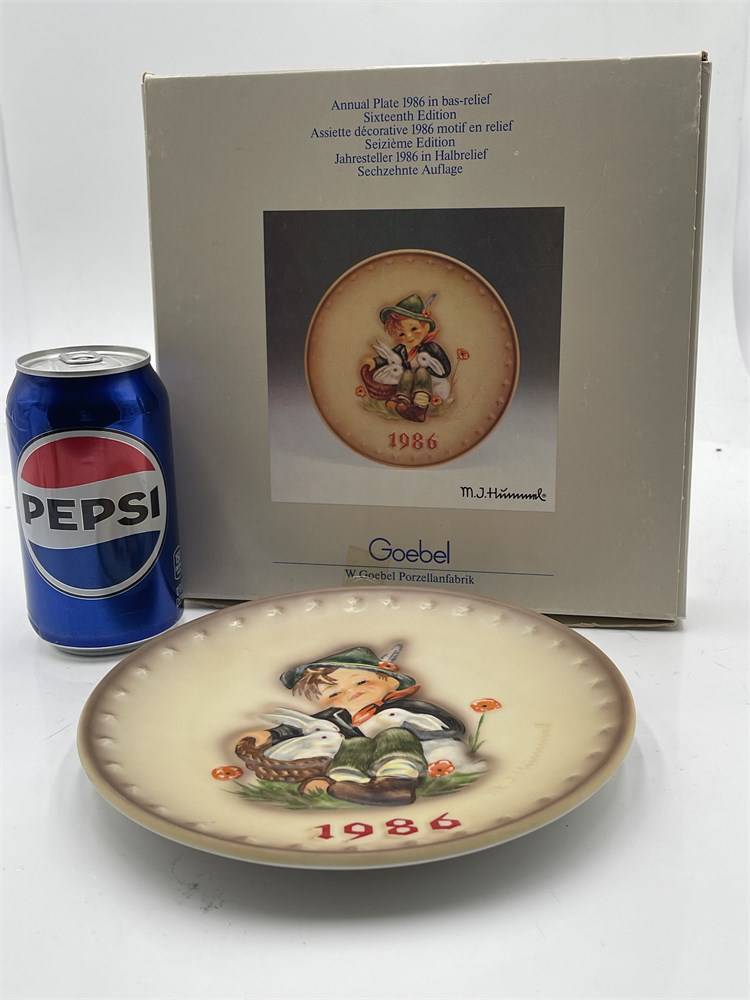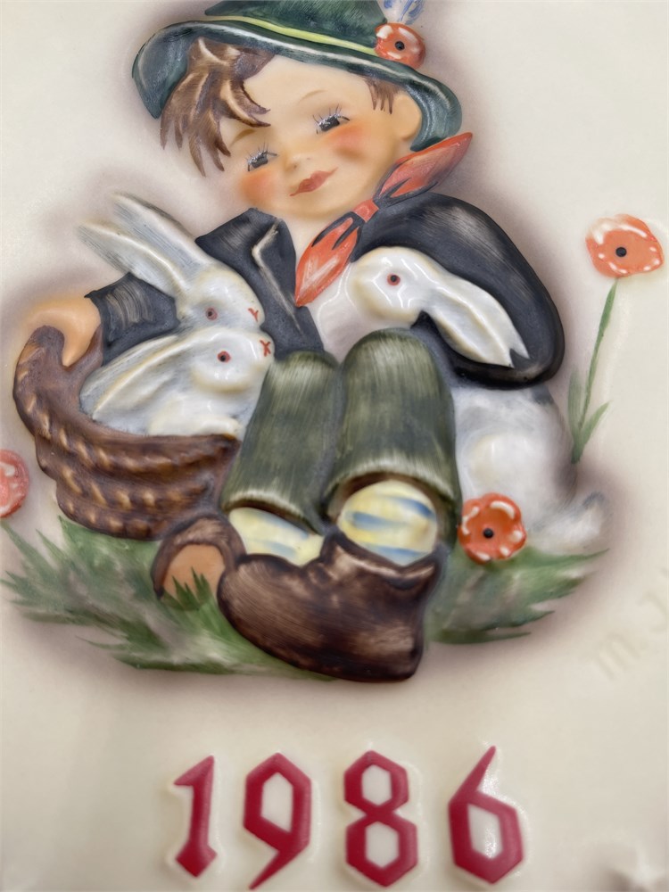 A Goebel M.J. Hummel 1986 Annual Plate, sixteenth edition in the series, model Hum 279, depicting the "Playmates" motif of a young boy seated with three rabbits. Hand-painted bas-relief porcelain with a matte-to-satin glaze in earth tones of green, brown, and grey on a cream ground, with red accents highlighting the date and the boy's scarf. The plate measures approximately 7.5 inches (19 cm) in diameter with a scalloped rim and two pre-drilled holes in the foot rim for wall hanging. Produced by W. Goebel Porzellanfabrik in Rödental, West Germany, the plate bears the TMK-6 "Missing Bee" trademark (in use 1979–1991), an incised M.J. Hummel signature on the front, and trilingual edition text on the reverse. The "Playmates" motif derives from Sister Maria Innocentia Hummel's (1909–1946) original artwork, first realized as figurine Hum 58 in 1936; the master sculptor for the annual plate series was Gerhard Skrobek (1922–2007). The Hummel Annual Plate series was inaugurated in 1971 to mark the Goebel factory's centennial and continued through 1995. A copyright date of 1973 incised on the reverse references the mold's original registration. Plate in excellent condition with no chips, cracks, or crazing; accompanied by the original box with minor shelf wear at corners.