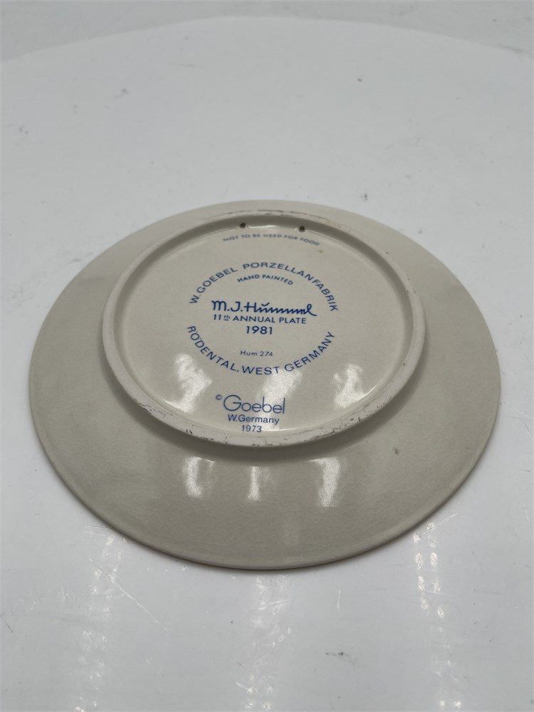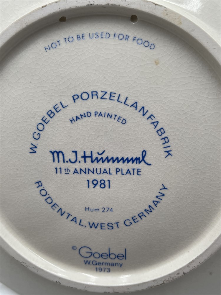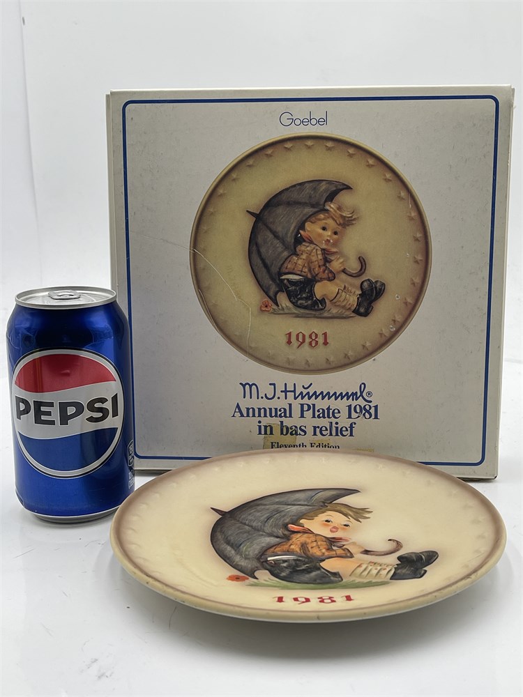 The eleventh edition in the M.I. Hummel Annual Plate series by W. Goebel Porzellanfabrik, Rödental, West Germany, model Hum 274, issued in 1981. The 7.5-inch diameter plate features a bas-relief depiction of the "Umbrella Boy" motif, based on the original artwork of Sister Maria Innocentia Hummel (1909–1946) and derived from the Hummel figurine Hum 152/A. Hand-painted in polychrome on a cream ground with a matte-to-satin glaze. The verso bears the TMK-6 ("Missing Bee") trademark in blue underglaze, the M.I. Hummel facsimile signature, "Eleventh Edition" designation, and factory markings including "W. Goebel Porzellanfabrik, Rodental, West Germany," with a design copyright date of 1973. The foot rim is pierced with two holes for wall mounting. The Annual Plate series was inaugurated in 1971 to mark the centenary of the Goebel factory; each edition was produced for a single year, after which the molds were destroyed. Accompanied by the original box. Condition: significant crazing visible across the front surface, consistent with age-related glaze stress in Goebel ceramics; box exhibits shelf wear, edge rubbing, and creasing.