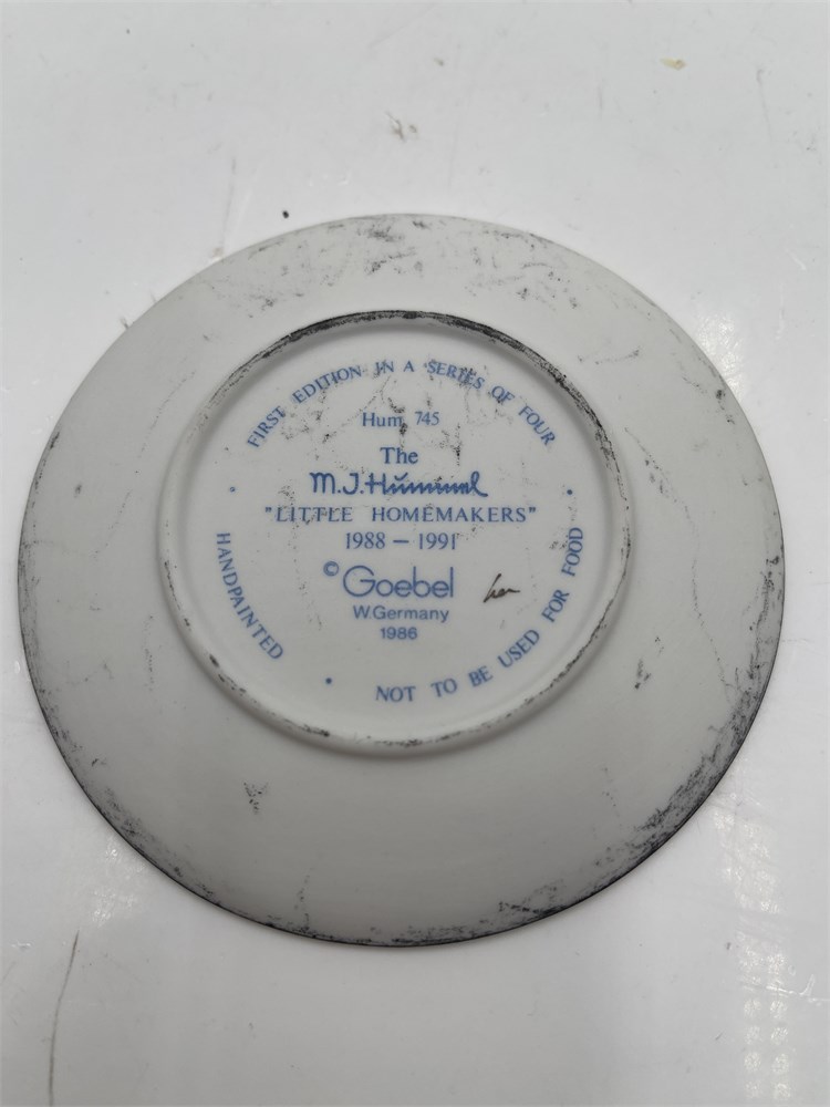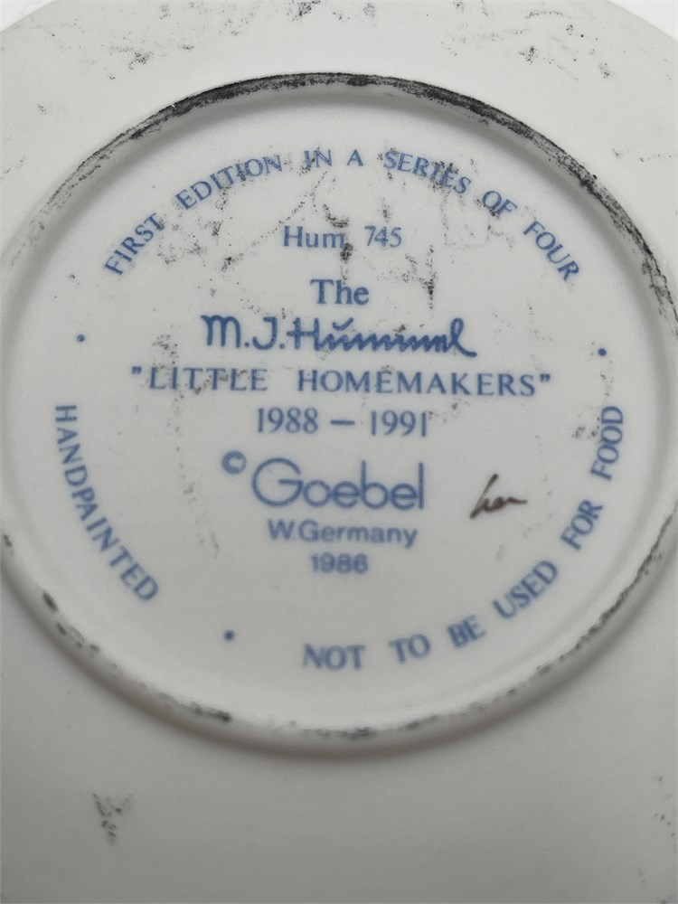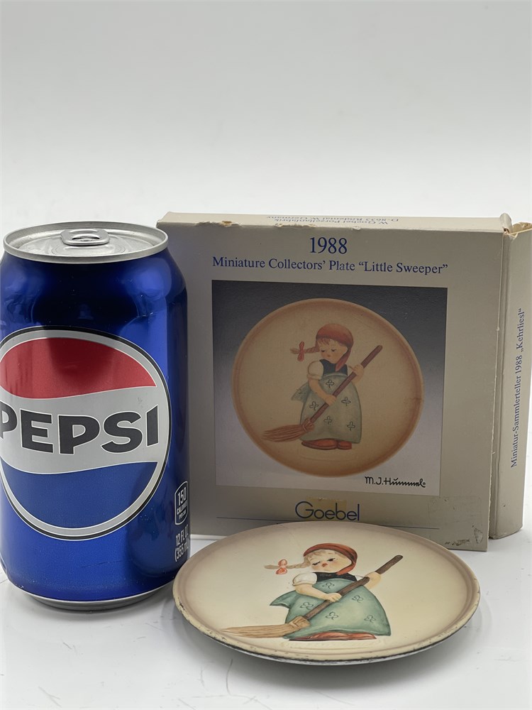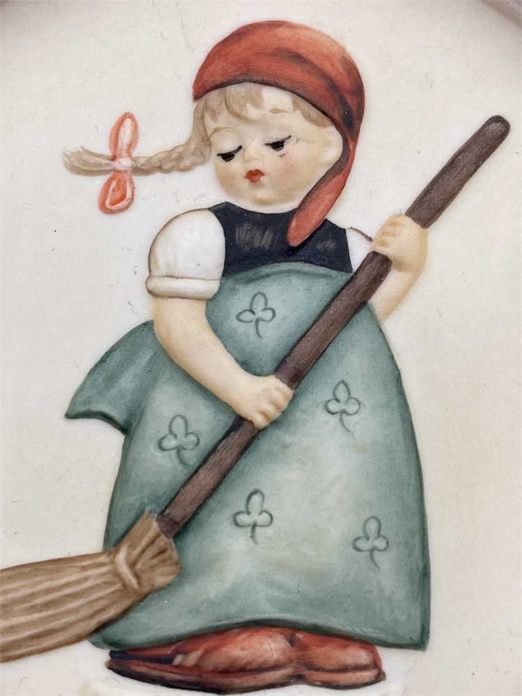 A Goebel M.J. Hummel miniature collector's plate, model Hum 745, titled 'Little Sweeper' (German: 'Kehrliesl'), the first edition in the four-part 'Little Homemakers' series issued from 1988 to 1991. Produced by W. Goebel Porzellanfabrik in Rödental, West Germany, the plate measures approximately 4 inches (10 cm) in diameter and features a bas-relief design of a young girl in a red headscarf and green clover-patterned dress sweeping with a brown broom, rendered in hand-painted matte bisque porcelain. The mold was created by master sculptor Gerhard Skrobek, with a copyright date of 1986 and a production date of 1988. The front bears the incised facsimile signature of Sister Maria Innocentia Hummel, whose original artwork inspired the Goebel Hummel line beginning in 1935. The reverse displays the Goebel TMK-6 ('Missing Bee') trademark, used between 1979 and 1991, along with a hand-painted decorator's mark consistent with the factory's artisan identification practices. The design corresponds to the existing Hummel figurine Hum 171. Accompanied by its original 'Little Homemakers' series cardboard box. The plate exhibits minor scuffing and dirt accumulation along the underside rim; the box displays wear, corner fraying, and creasing consistent with age and handling.